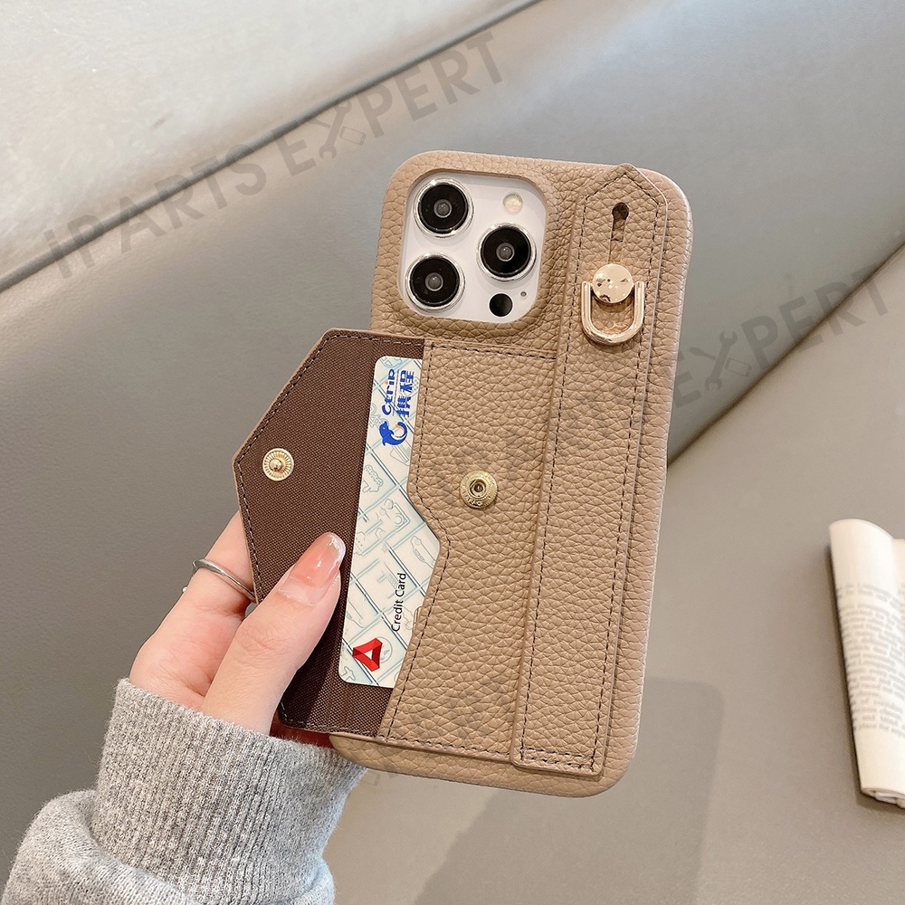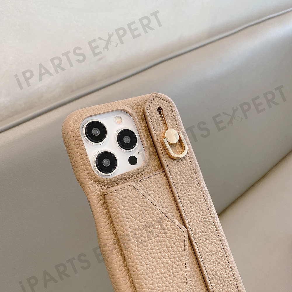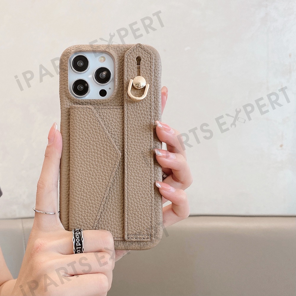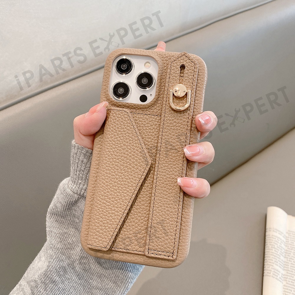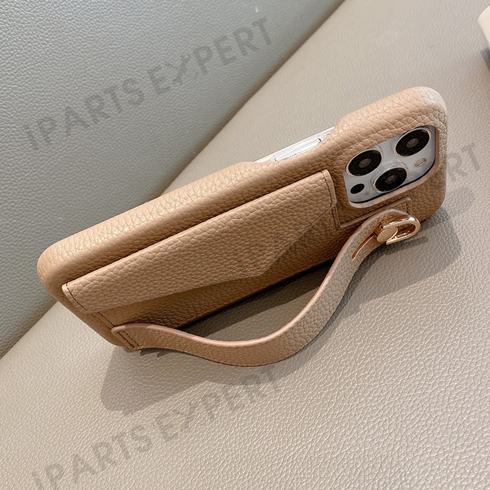 For iPhone 14 Pro Max Case with Card Slot Wristband Kickstand PU Leather+PET Phone Cover - Light Brown