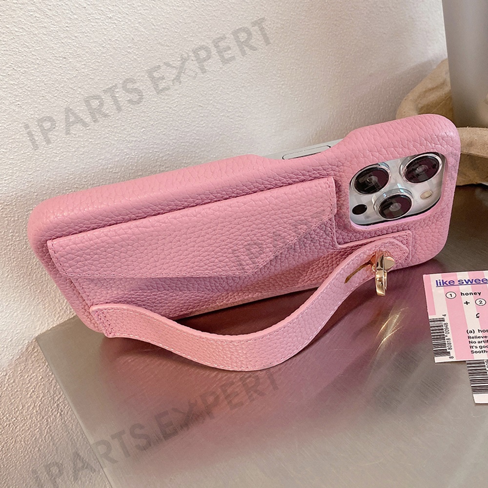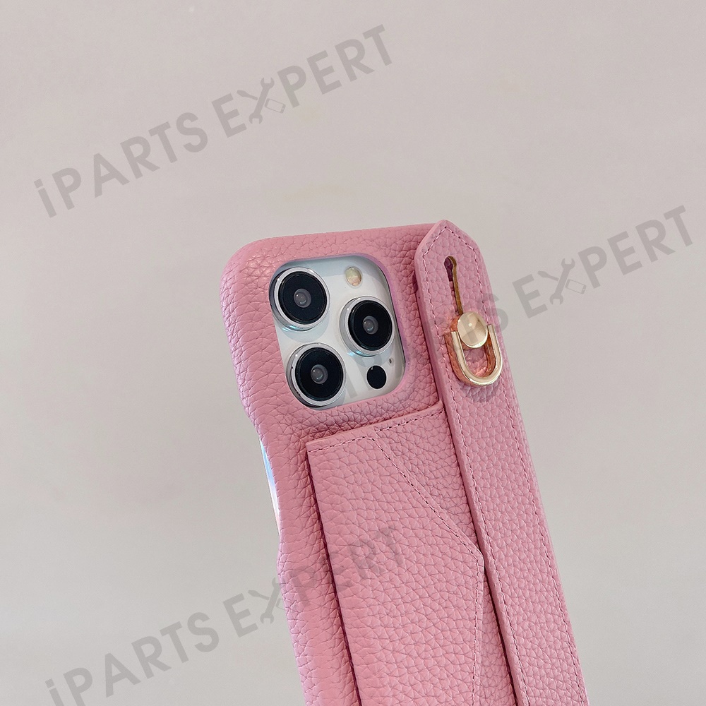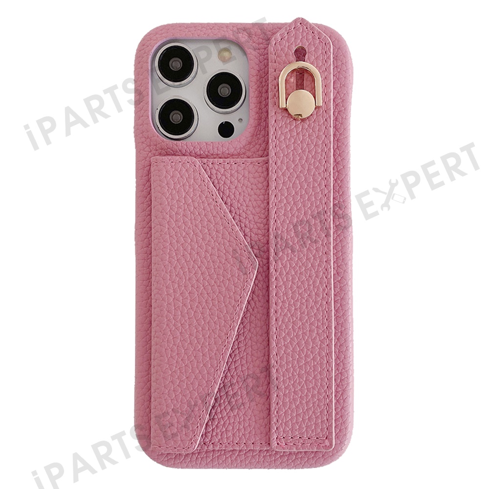 For iPhone 14 Pro Max Case with Card Slot Wristband Kickstand PU Leather+PET Phone Cover - Pink