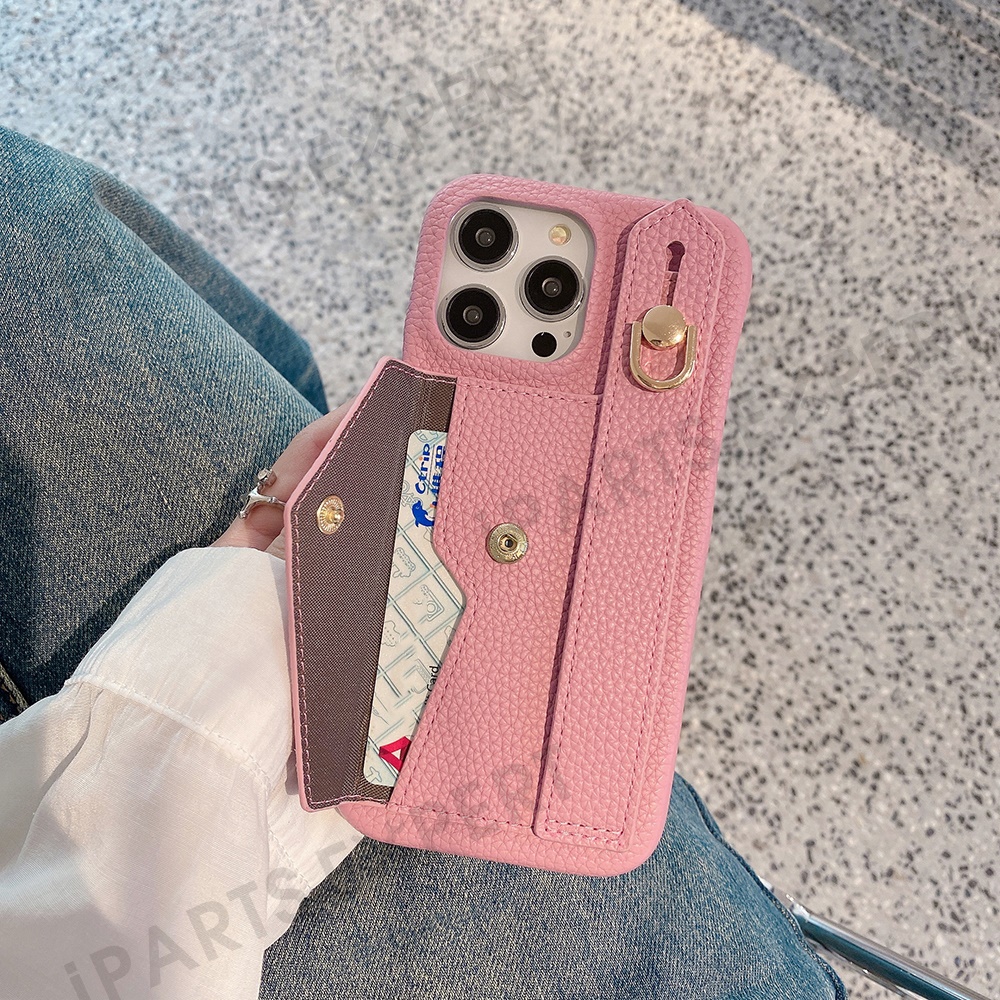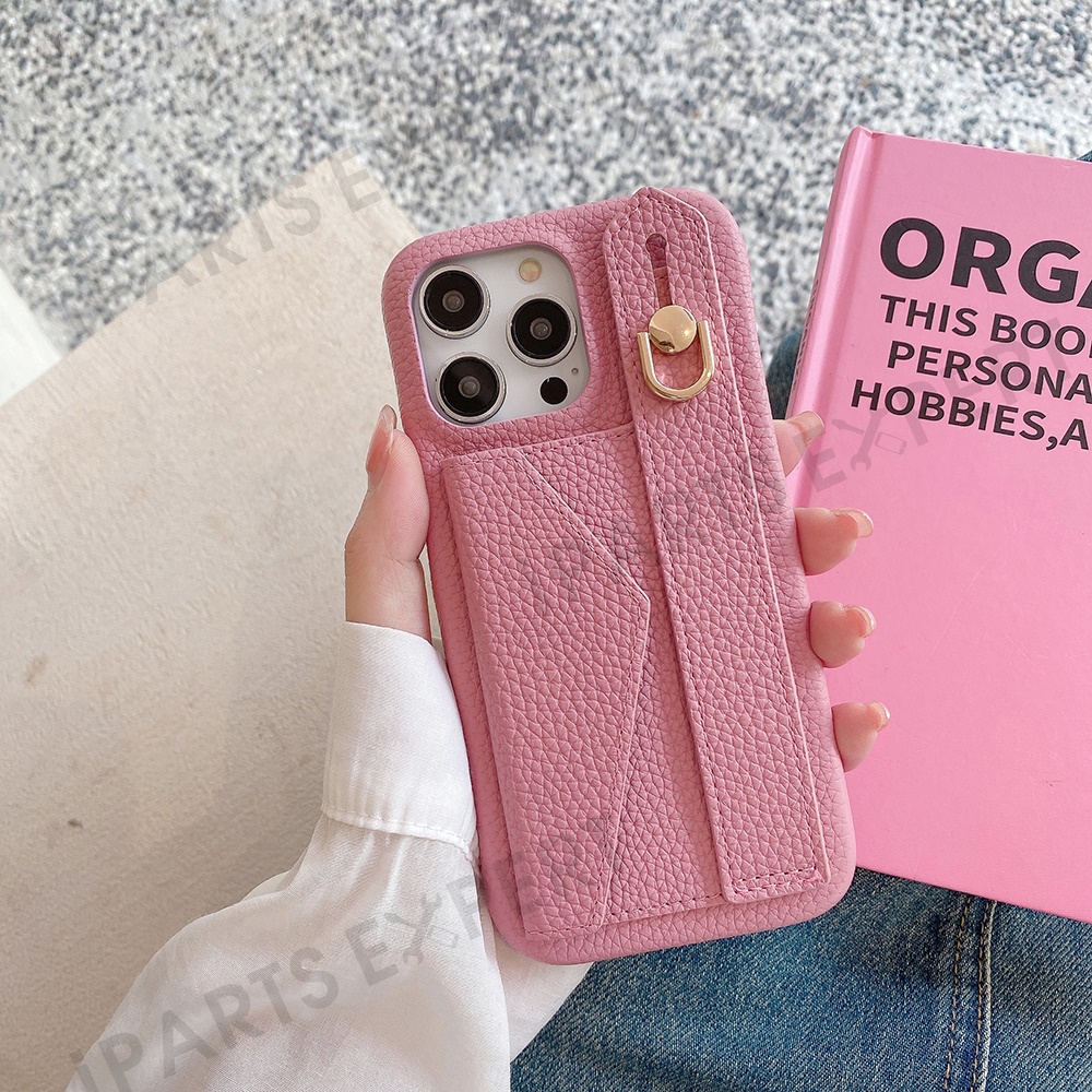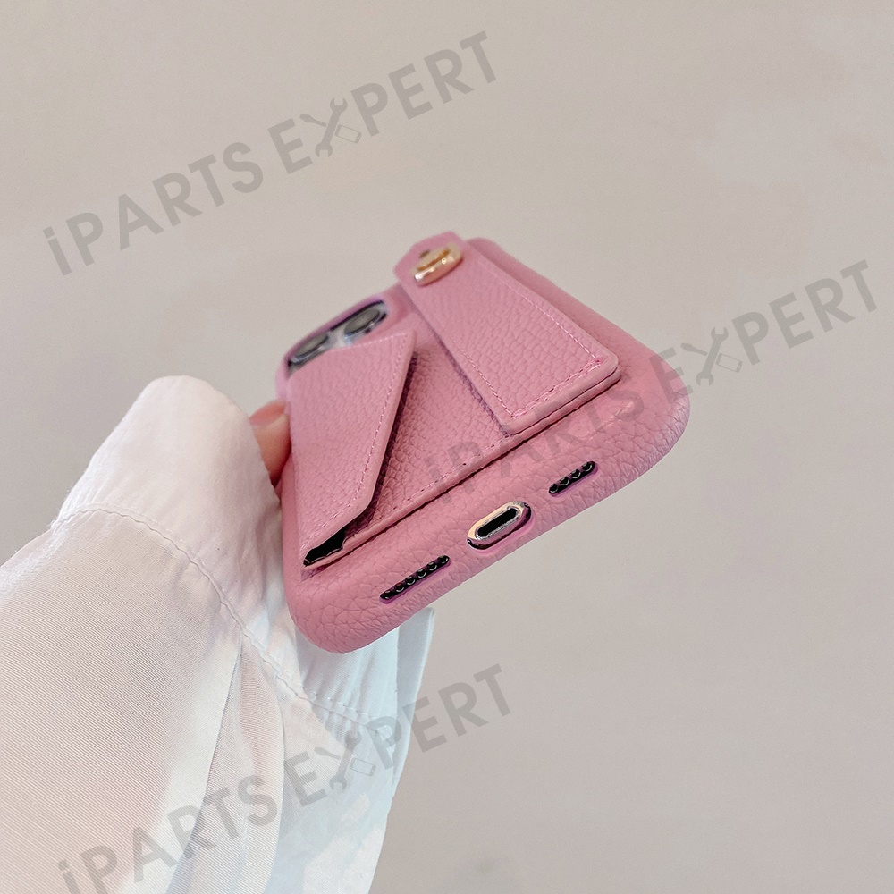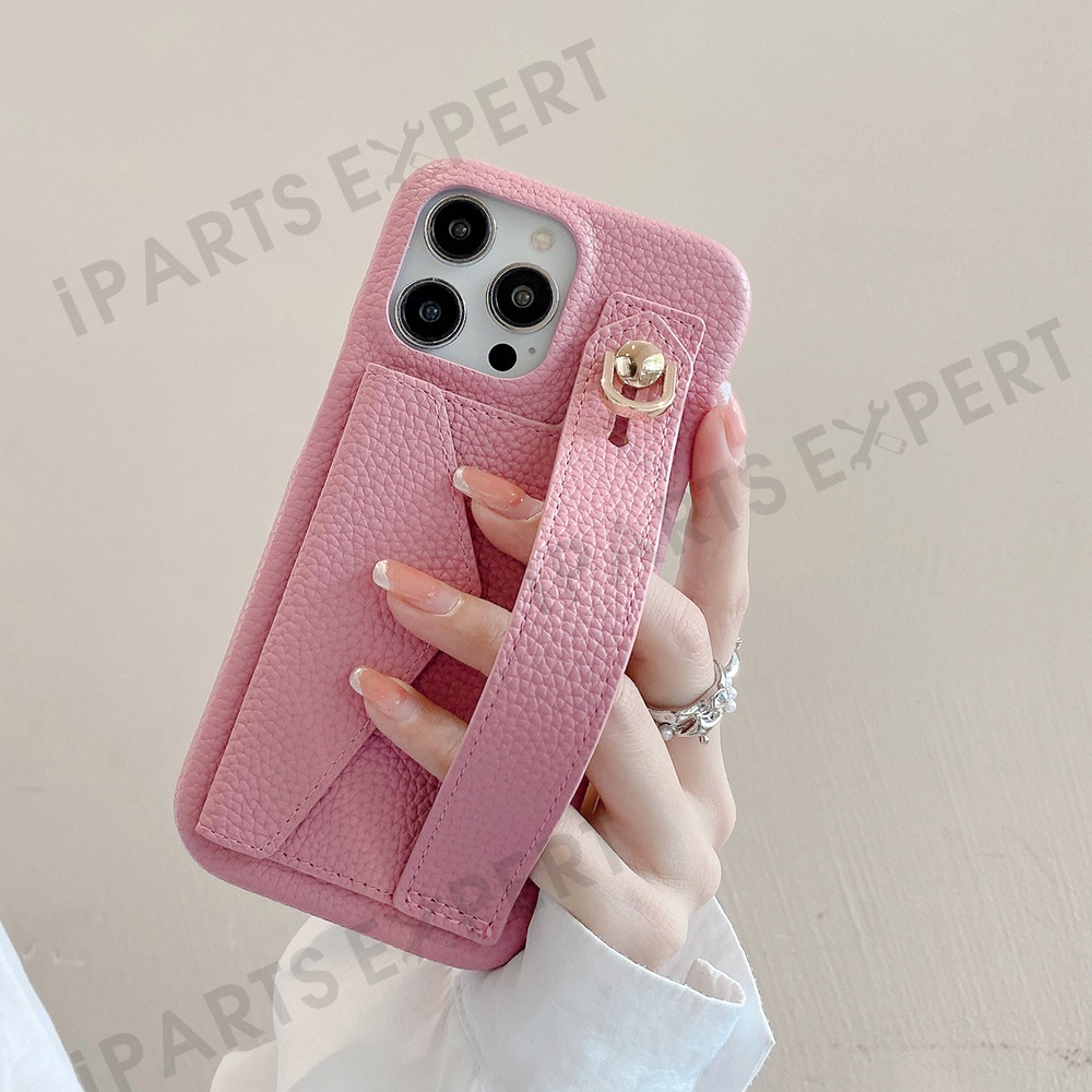 For iPhone 14 Pro Max Case with Card Slot Wristband Kickstand PU Leather+PET Phone Cover - Pink
