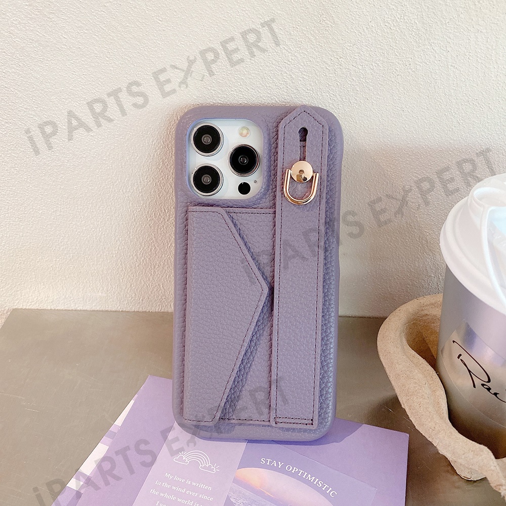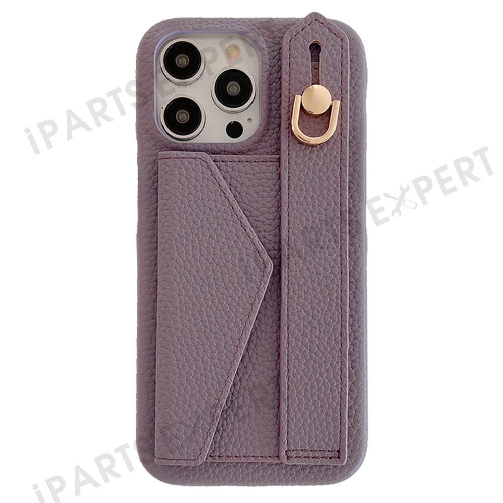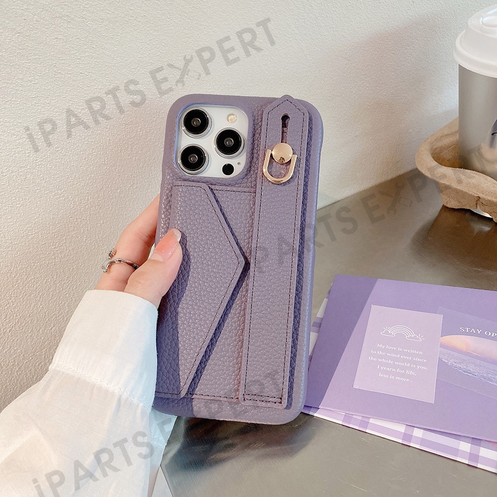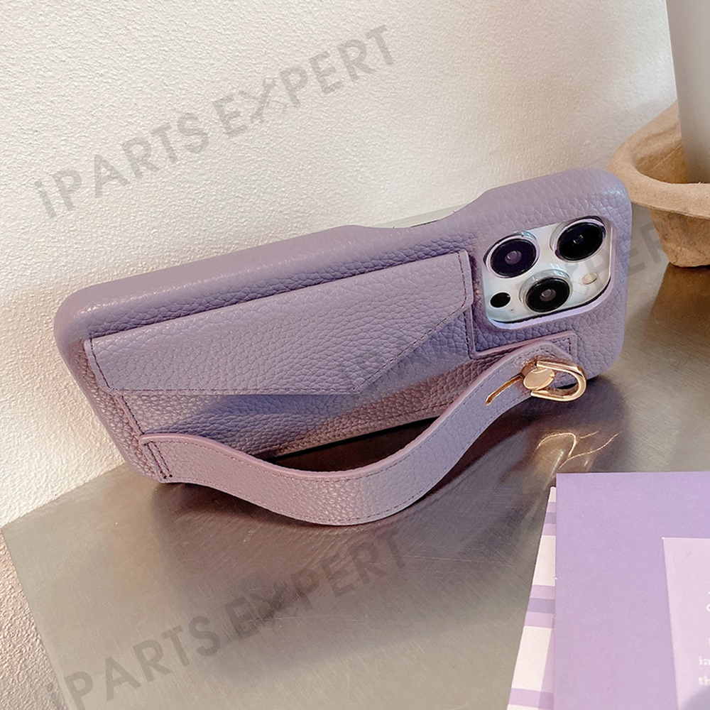 For iPhone 14 Pro Max Case with Card Slot Wristband Kickstand PU Leather+PET Phone Cover - Purple