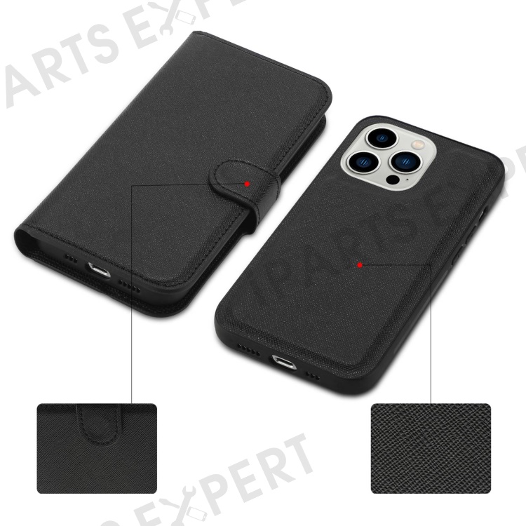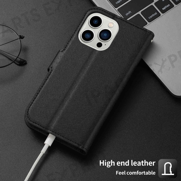 For iPhone 14 Pro Max Cross Texture Flodable Stand Leather Wallet Cover Detachable TPU Protective Case - Black