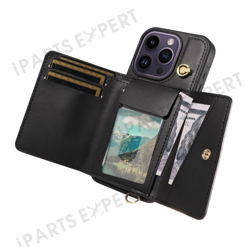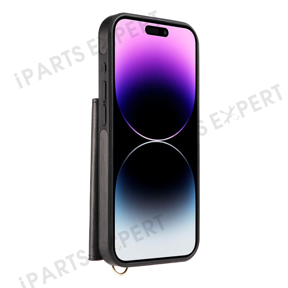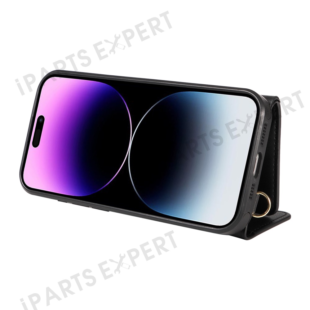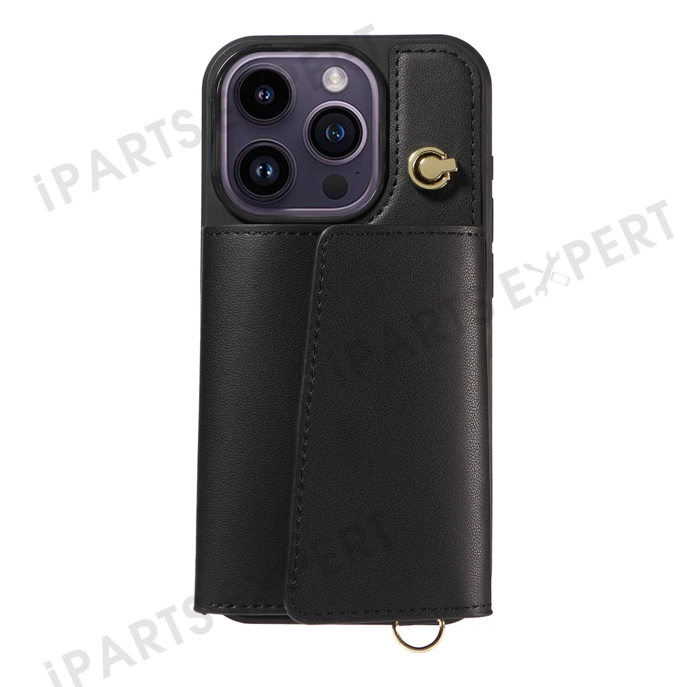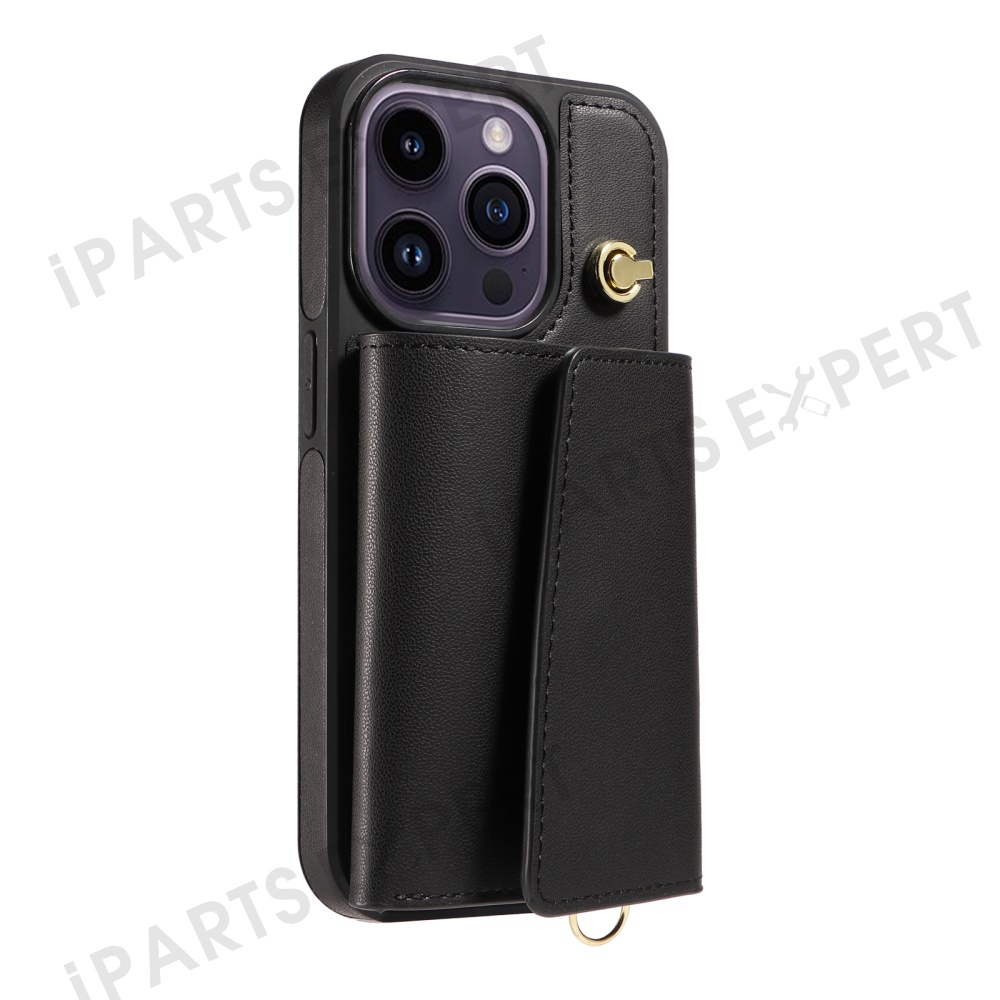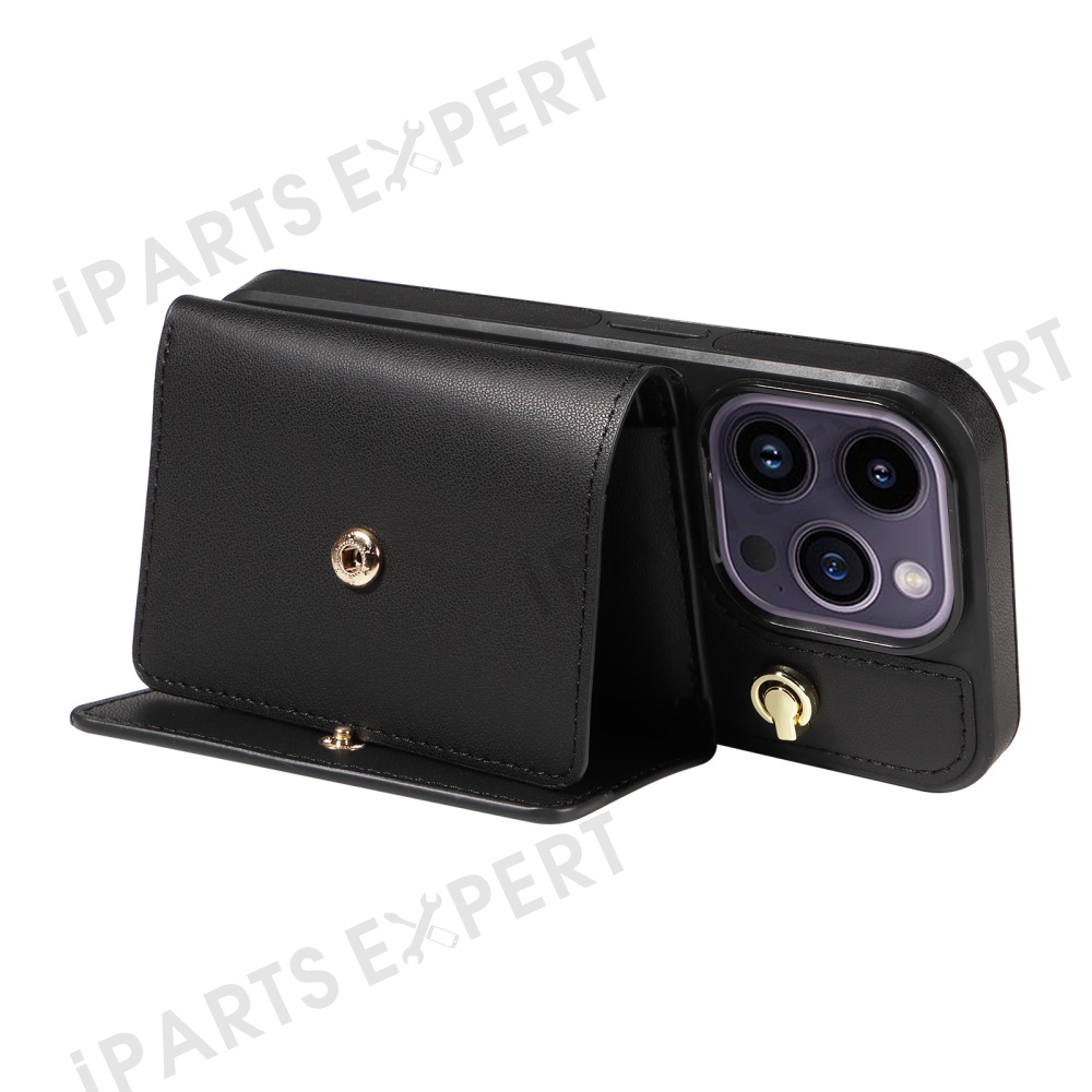 For iPhone 14 Pro Max Crossbody Phone Case Card Holder Kickstand Leather Coated TPU Mobile Cover - Black