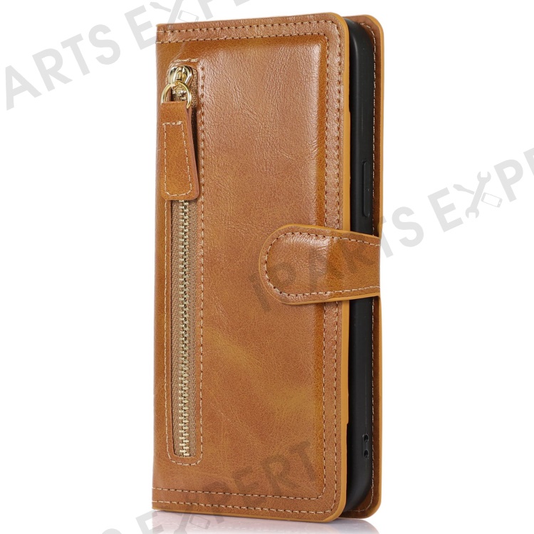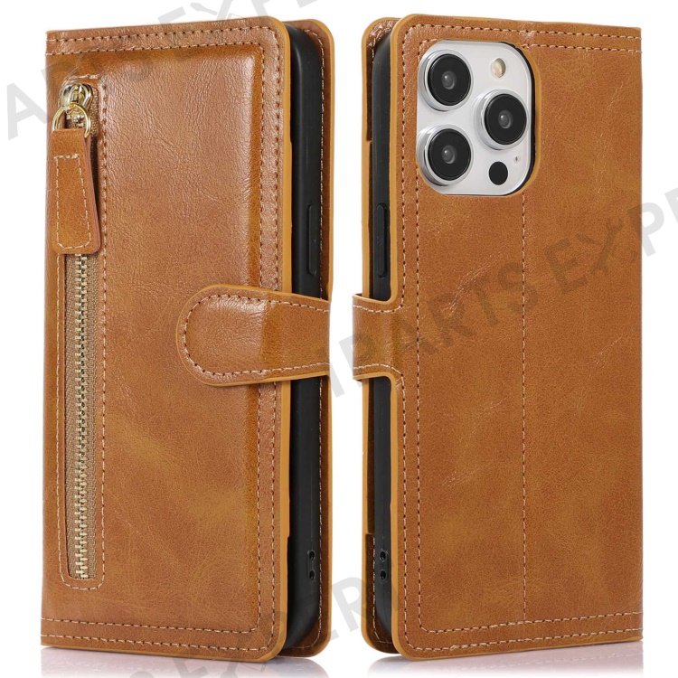 For iPhone 14 Pro Max Drop-proof Zipper Pocket Phone Flip Wallet Case with Magnetic Buckle Protective PU Leather Phone Cover Stand - Orange