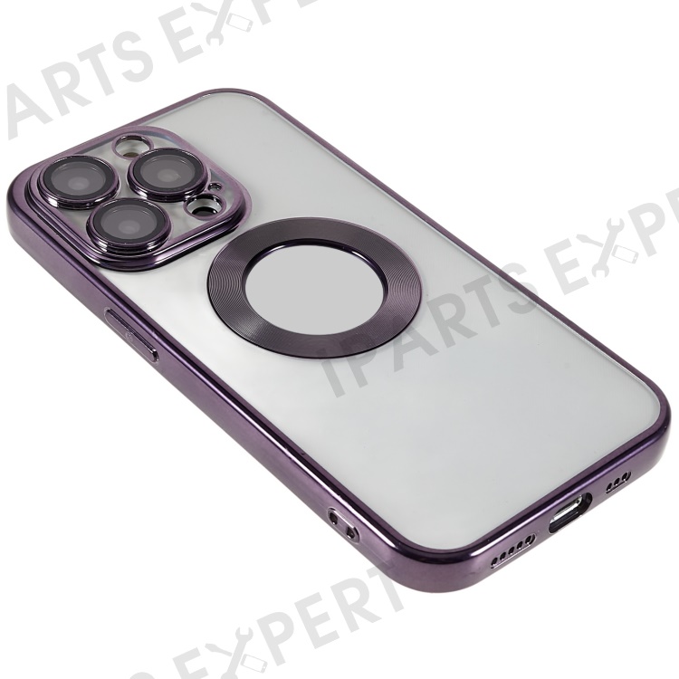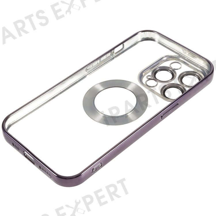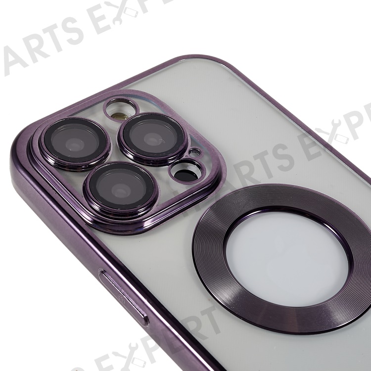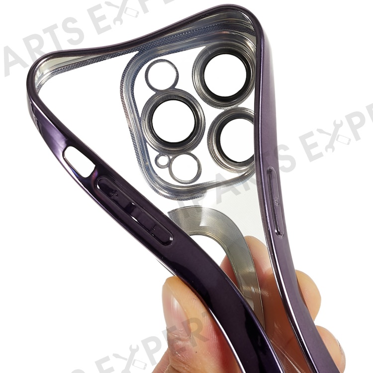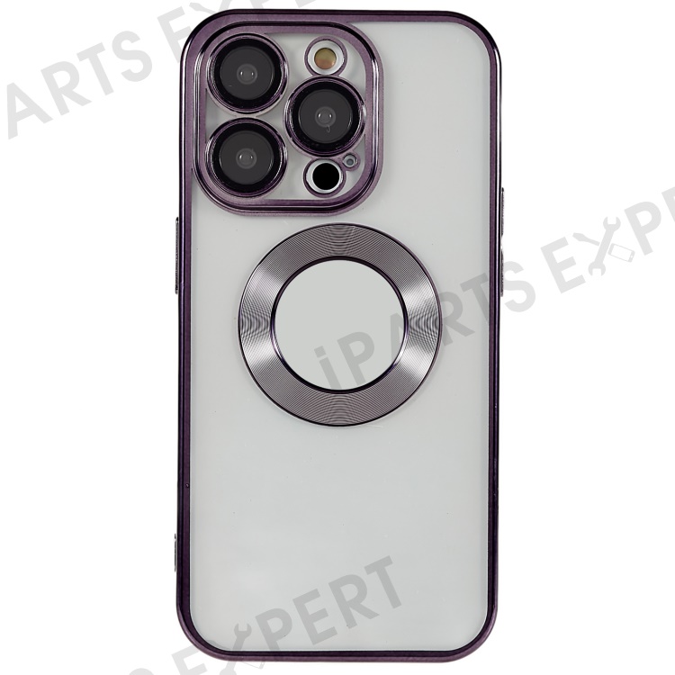 For iPhone 14 Pro Max Electroplating Edges Transparent Phone Case CD Texture Ring Logo Hole Design Soft TPU Shockproof Cover with Built-in Camera Lens Protector - Purple