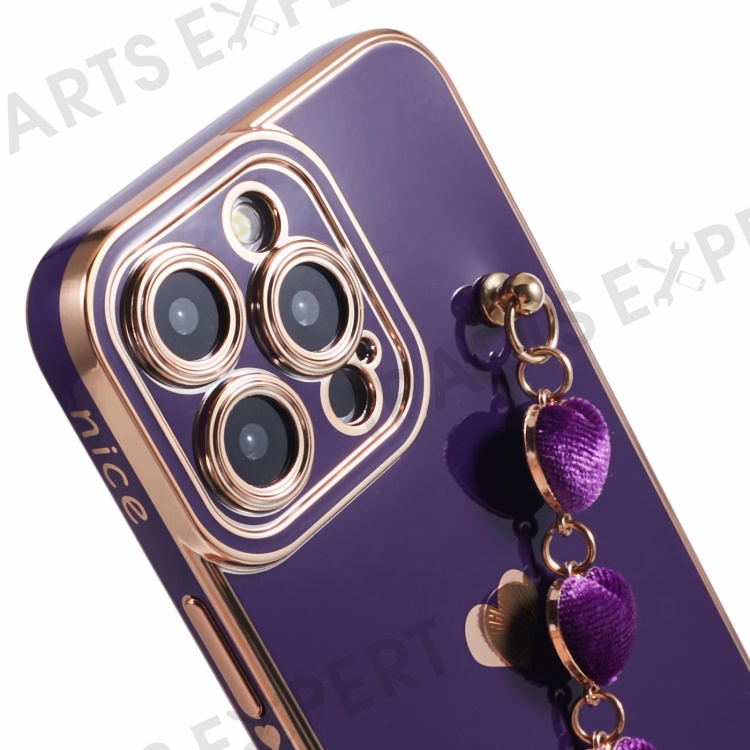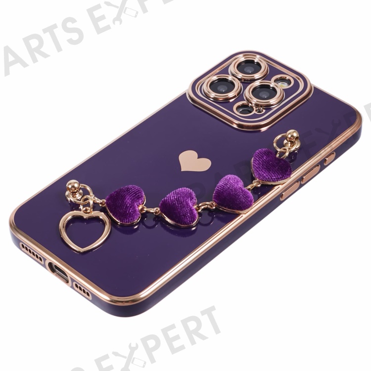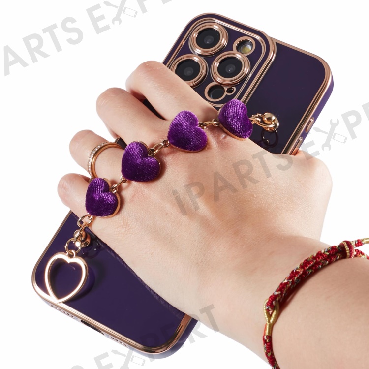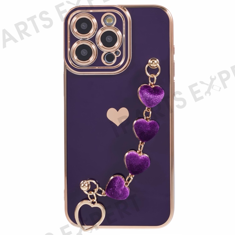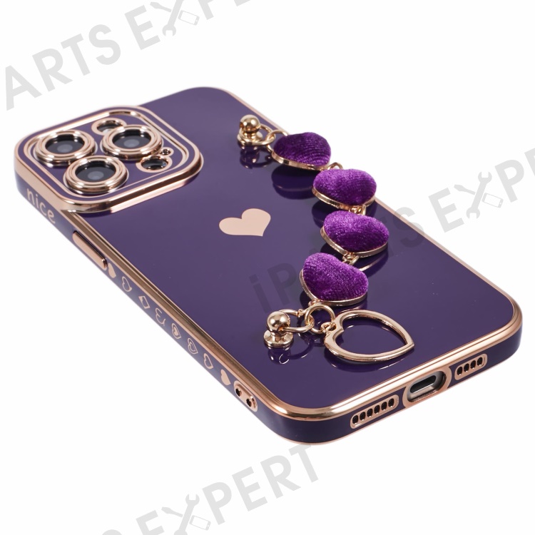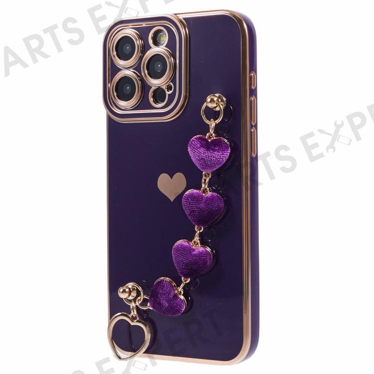For iPhone 14 Pro Max Electroplating Phone Case Soft TPU Back Cover with Plush Love-Heart Strap - Dark Purple