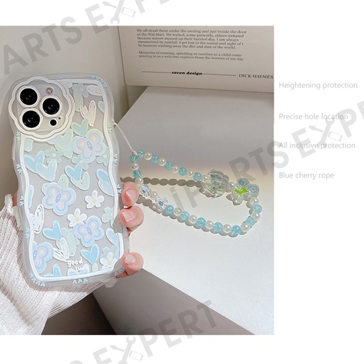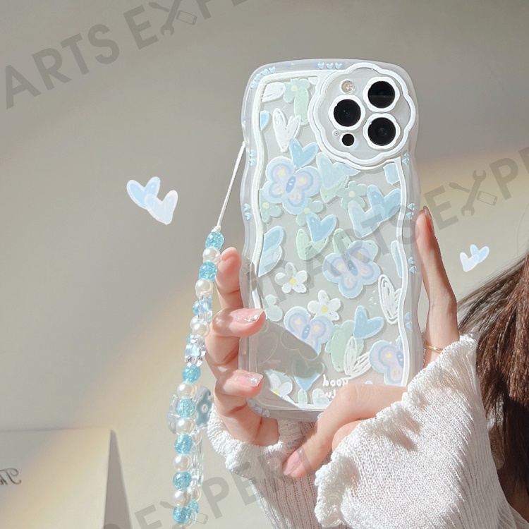 For iPhone 14 Pro Max Transparent Phone Case Heart Shape Butterfly Pattern TPU Cover with Bead Chain