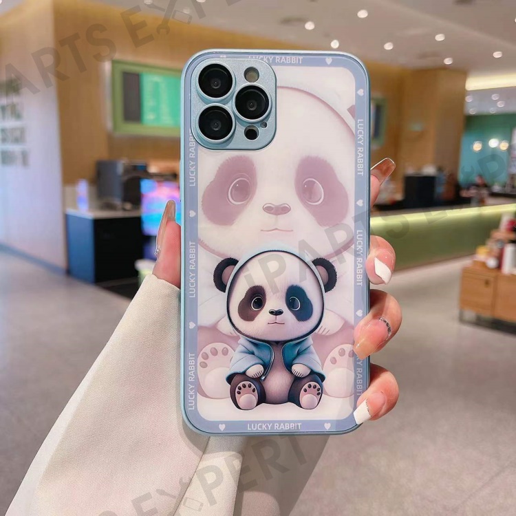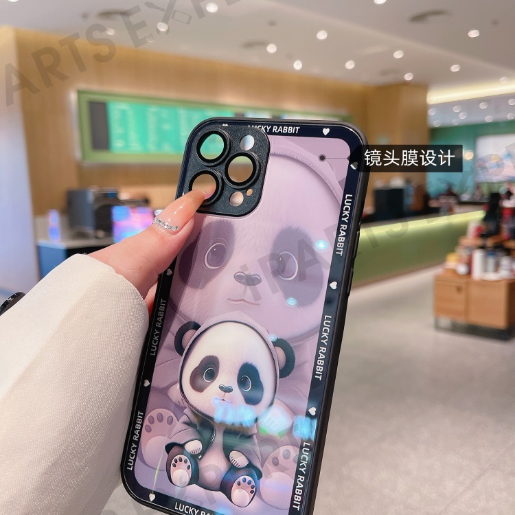 For iPhone 14 Pro Max Tempered Glass+TPU Phone Case Shadow Panda Pattern Cover with Lens Film - Blue