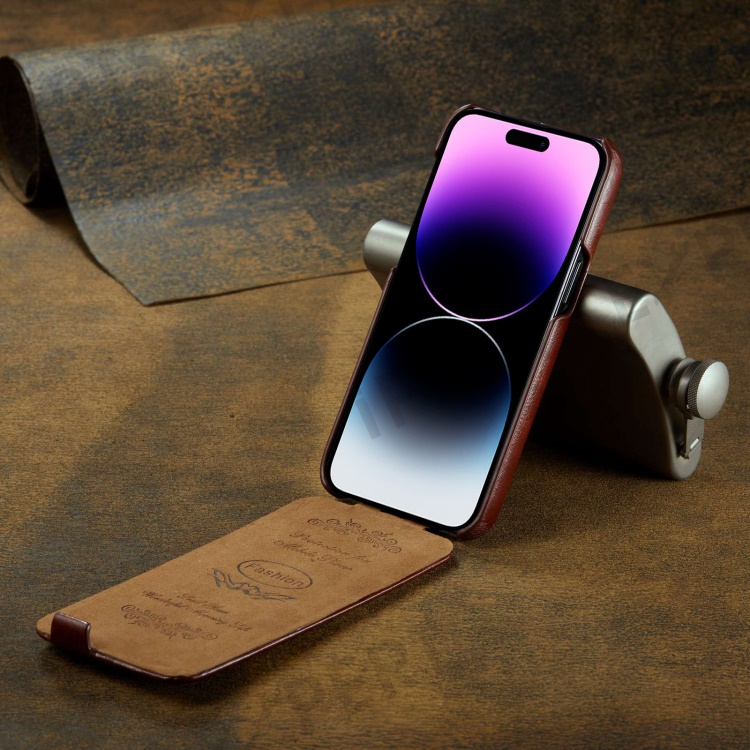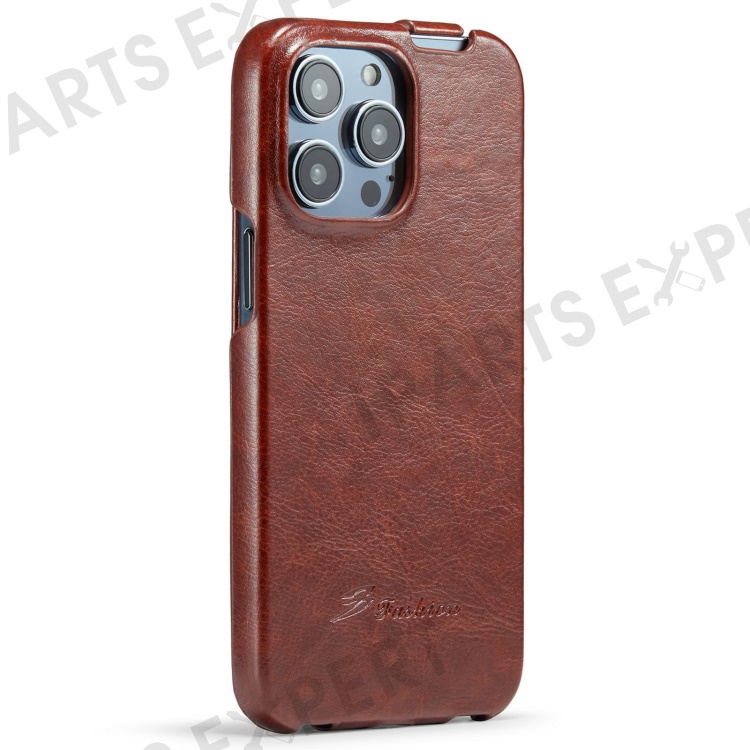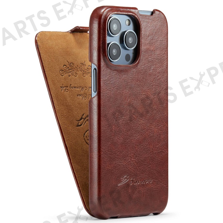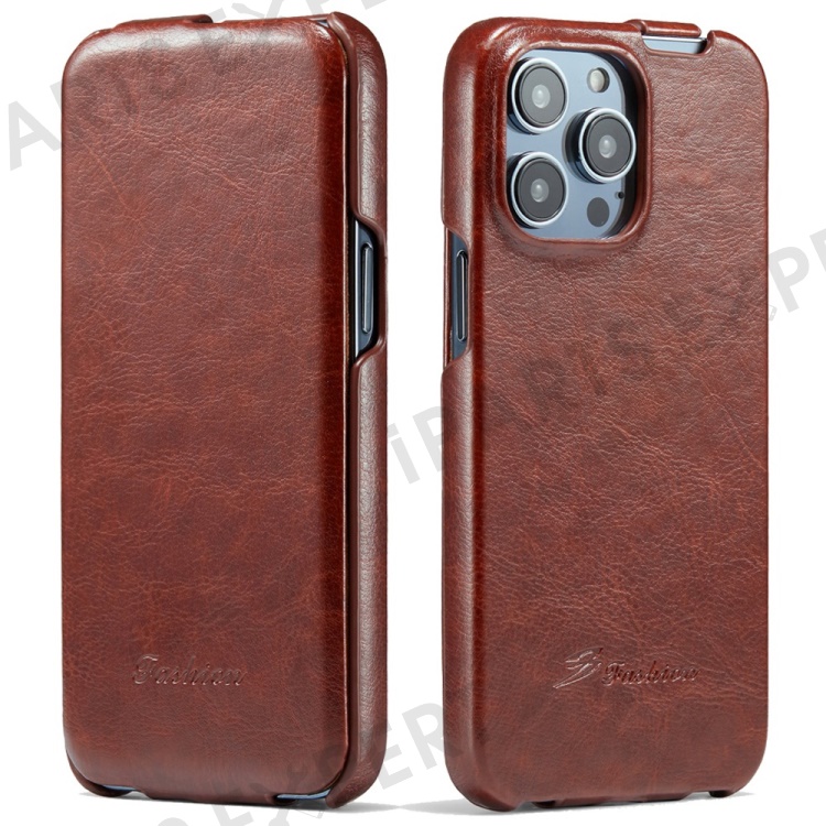For iPhone 14 Pro Vertical Flip Down Cover Imprinted Pattern Crazy Horse Texture PU Leather Anti-Scratch Cell Phone Case - Brown