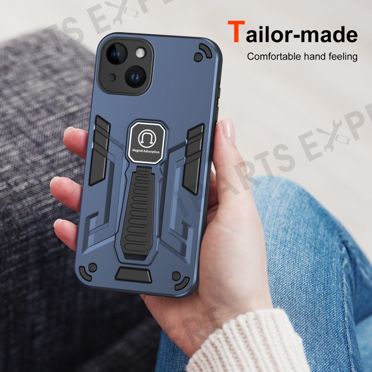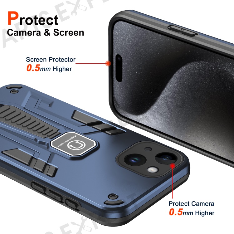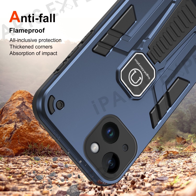 For iPhone 14 Shockproof Case Kickstand Phone Cover Built-in Magnetic Holder Metal Sheet - Blue