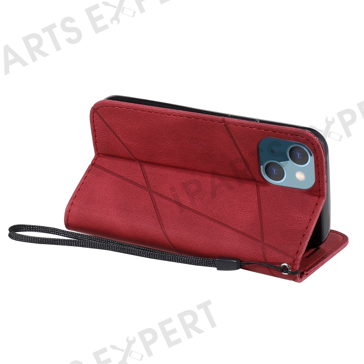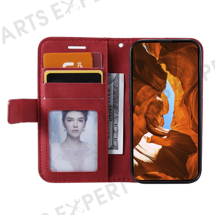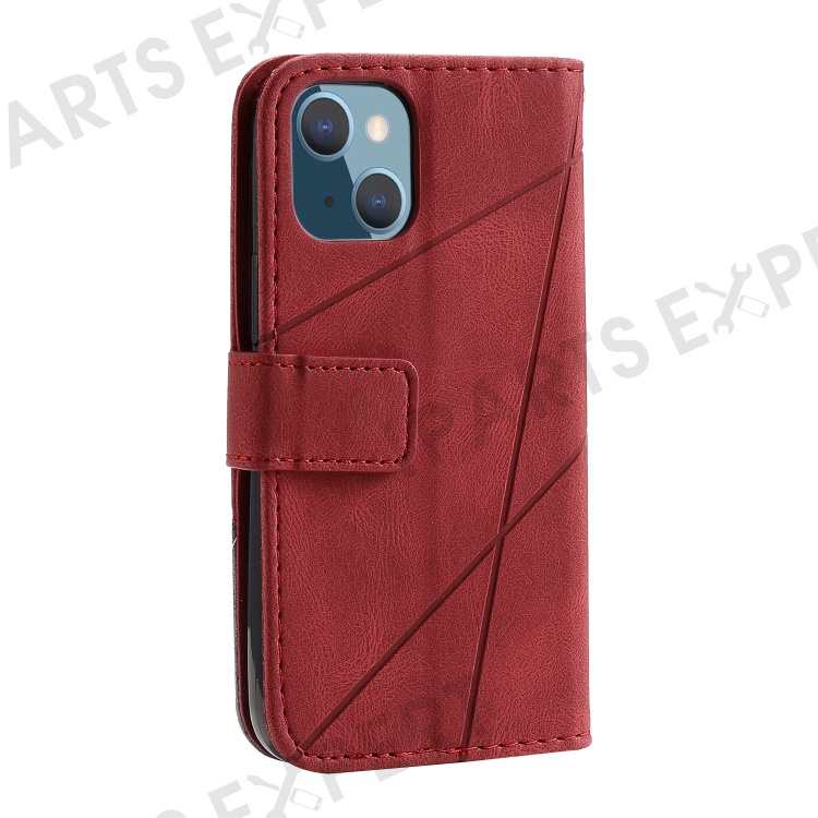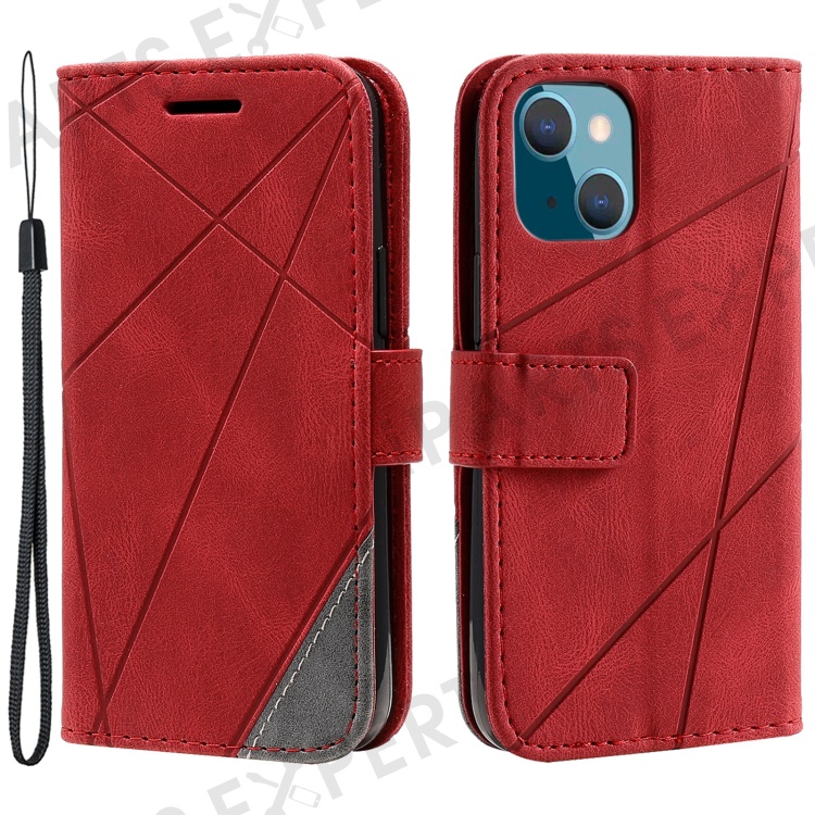 For iPhone 14 Wallet Case Splicing Leather Stand Phone Cover with Hand Strap - Red