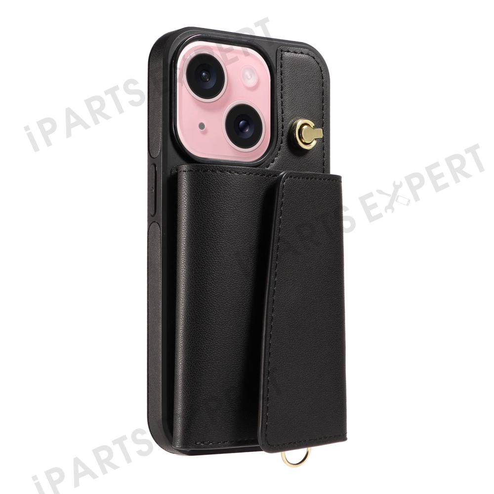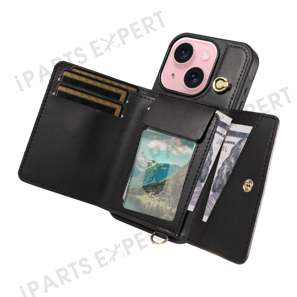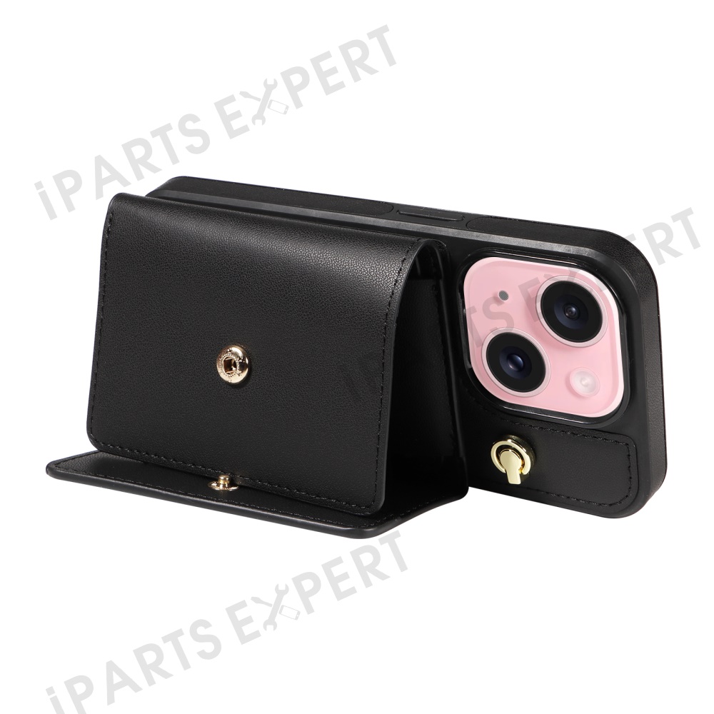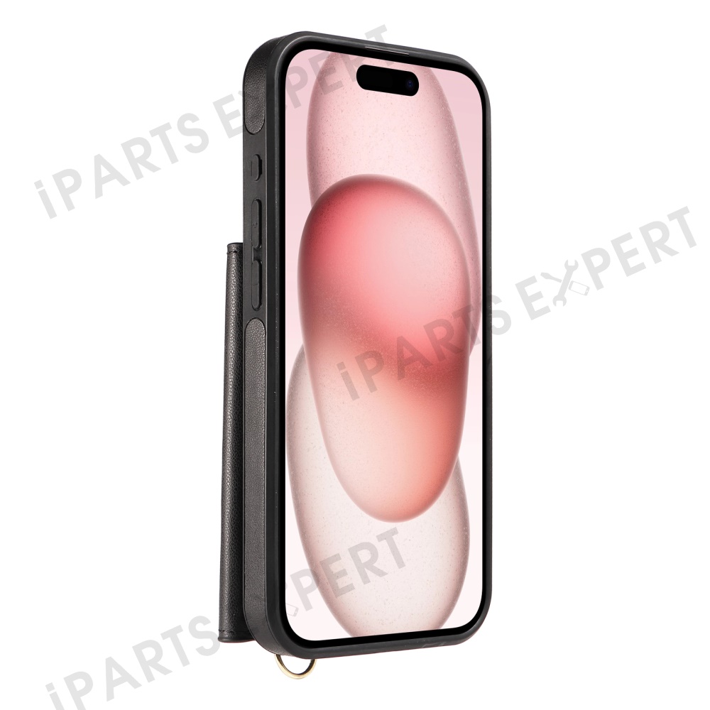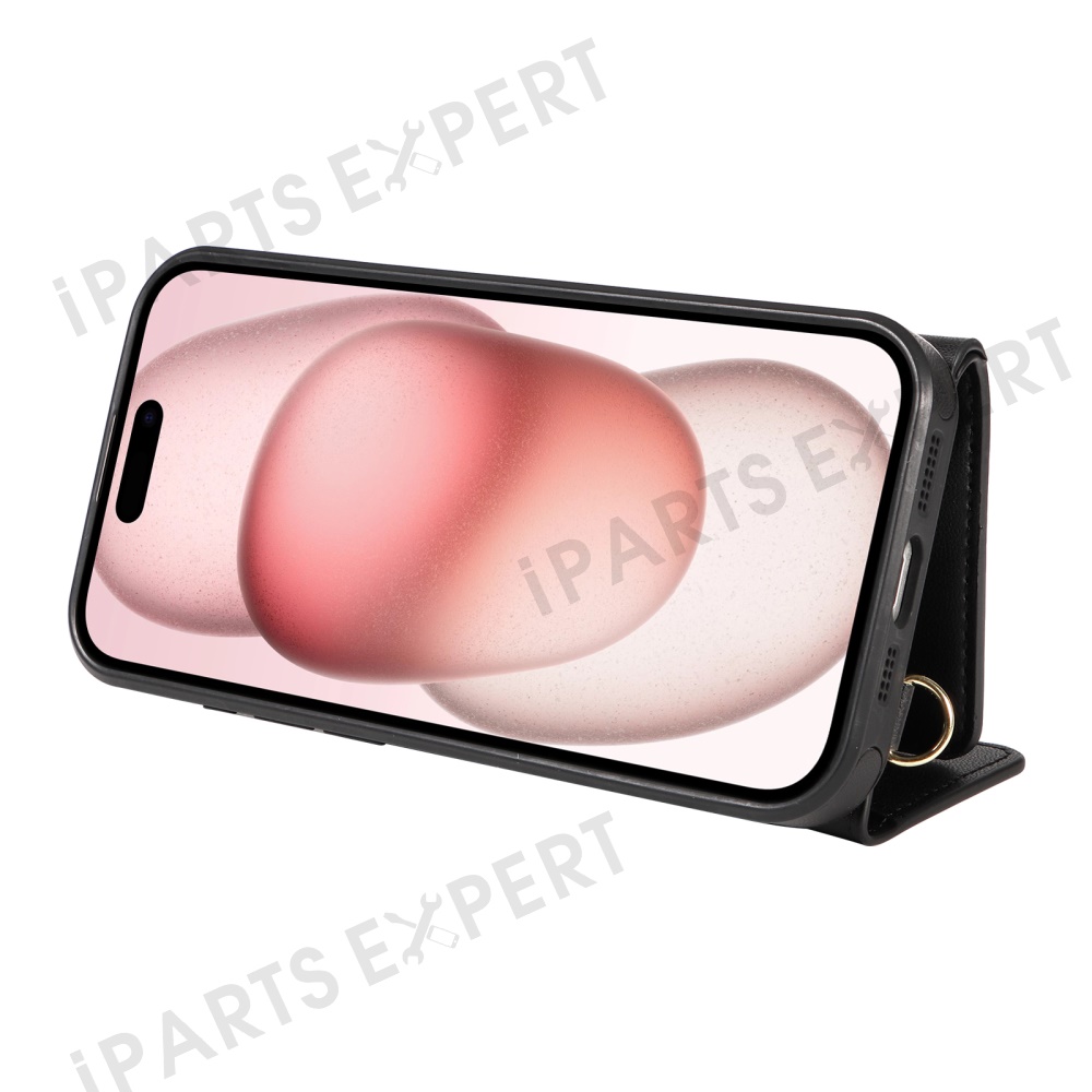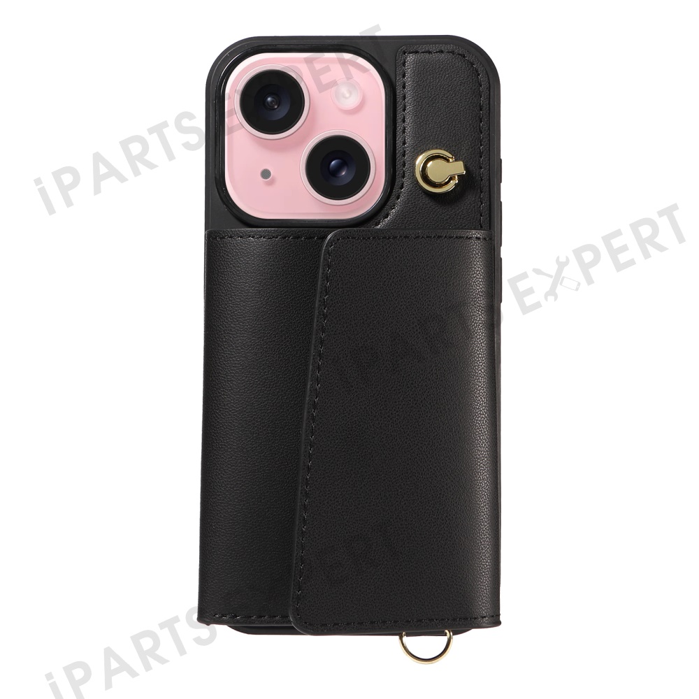 For iPhone 15 Crossbody Phone Case Card Holder Kickstand Leather Coated TPU Mobile Cover - Black