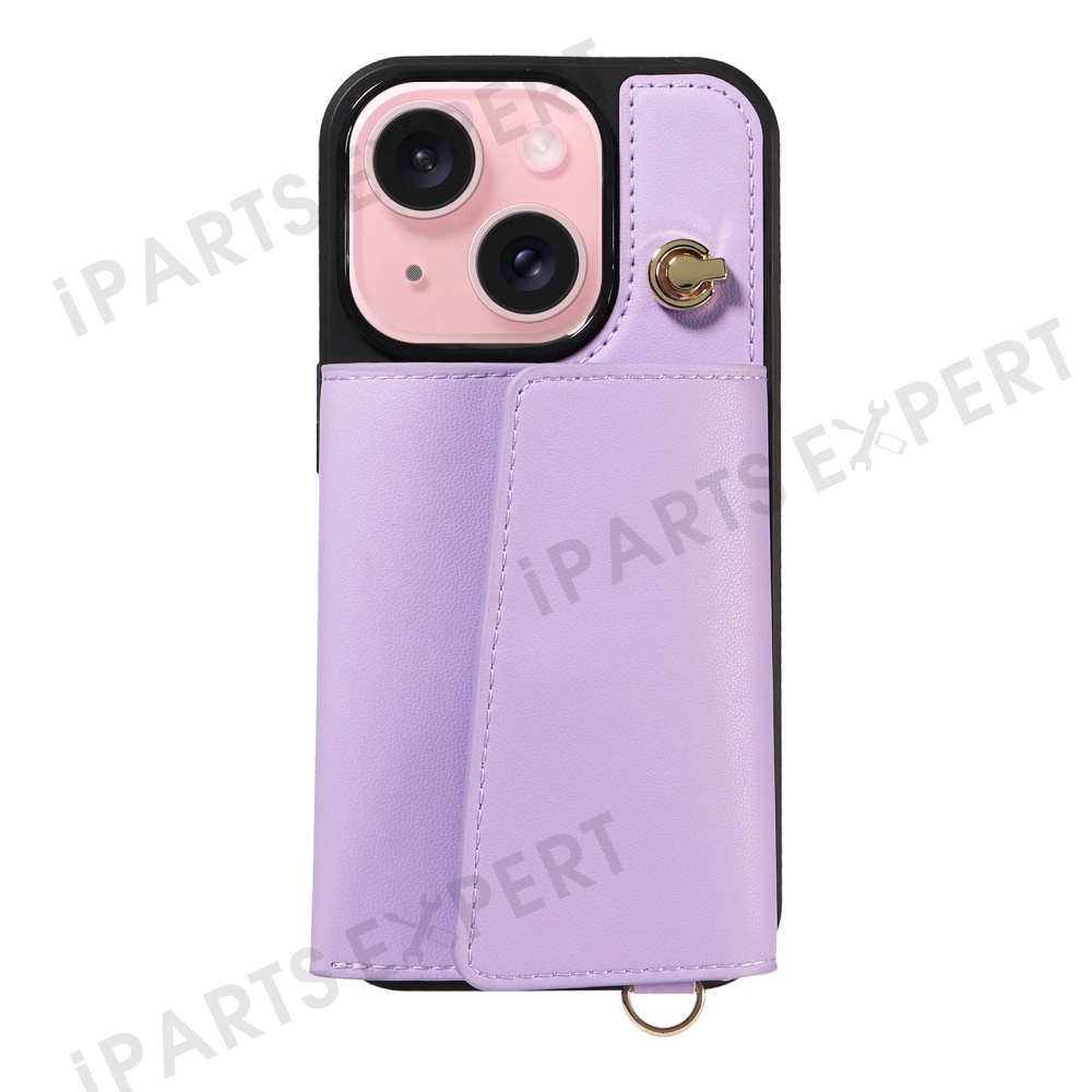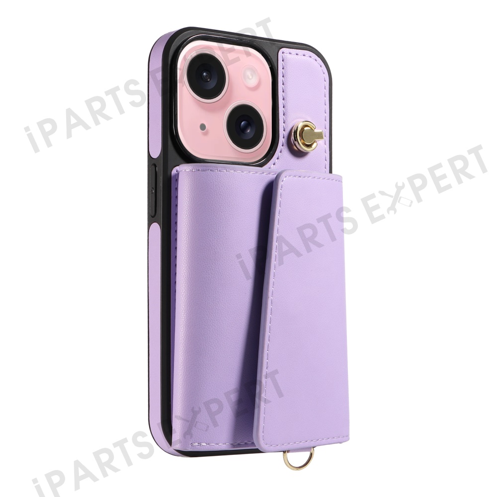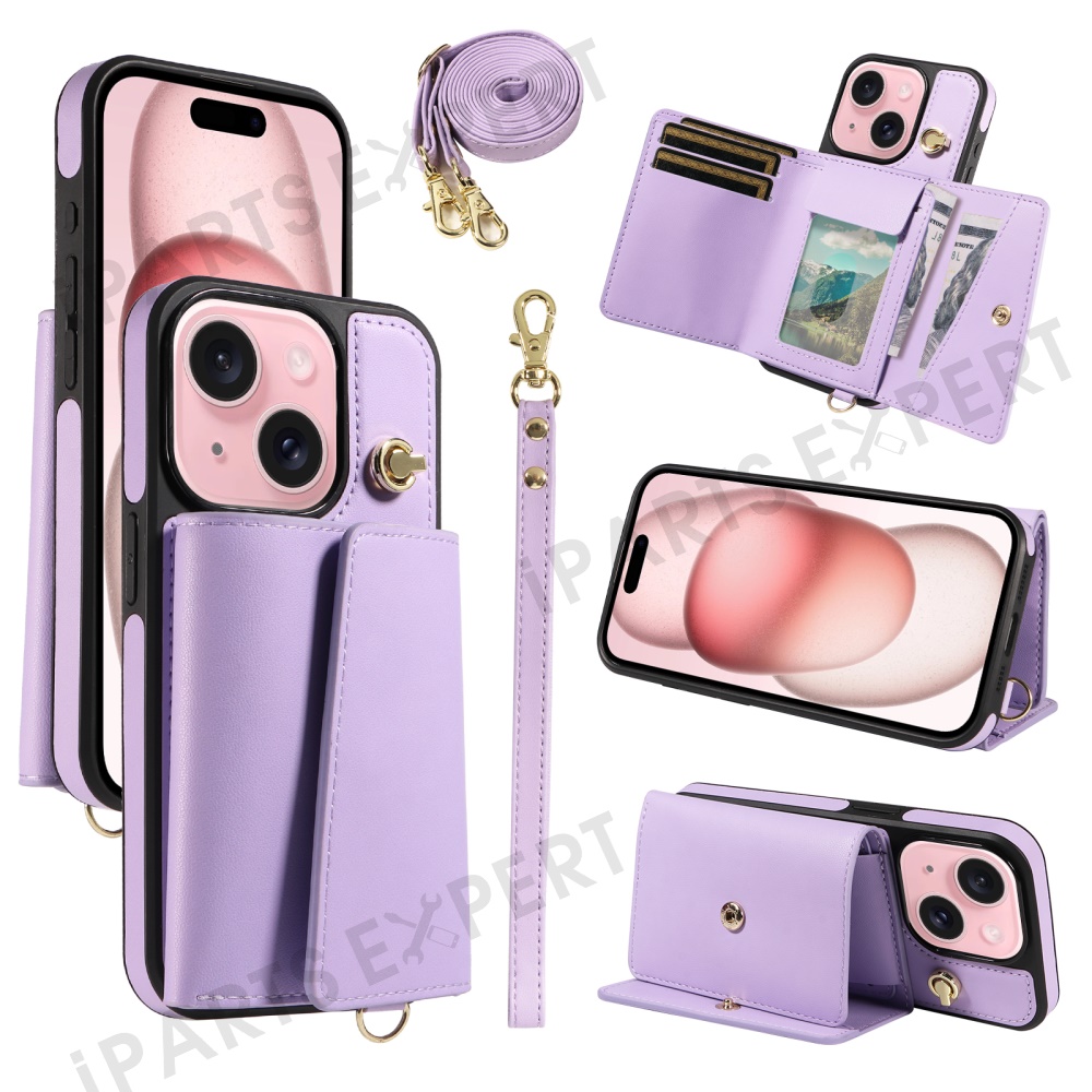 For iPhone 15 Crossbody Phone Case Card Holder Kickstand Leather Coated TPU Mobile Cover - Purple