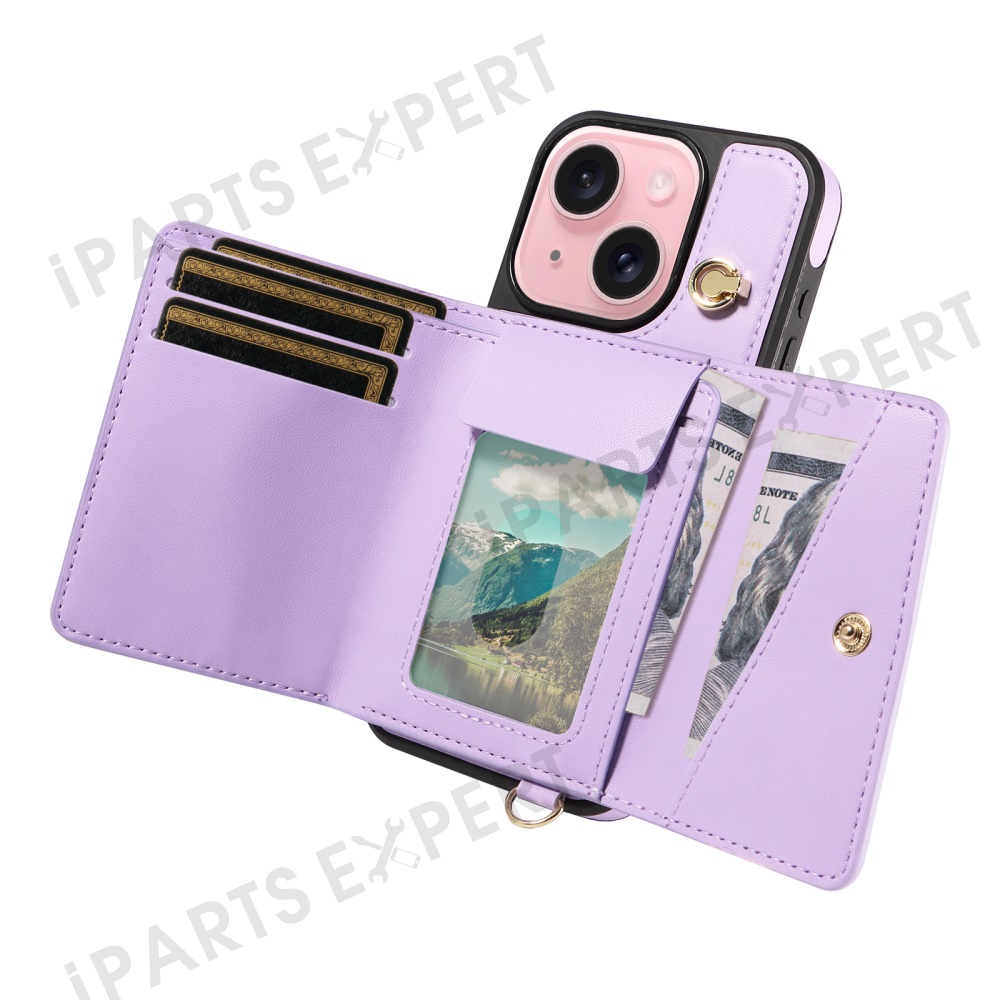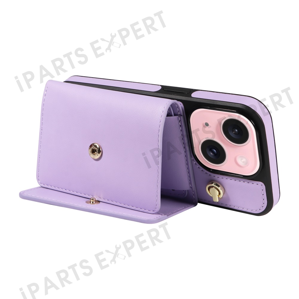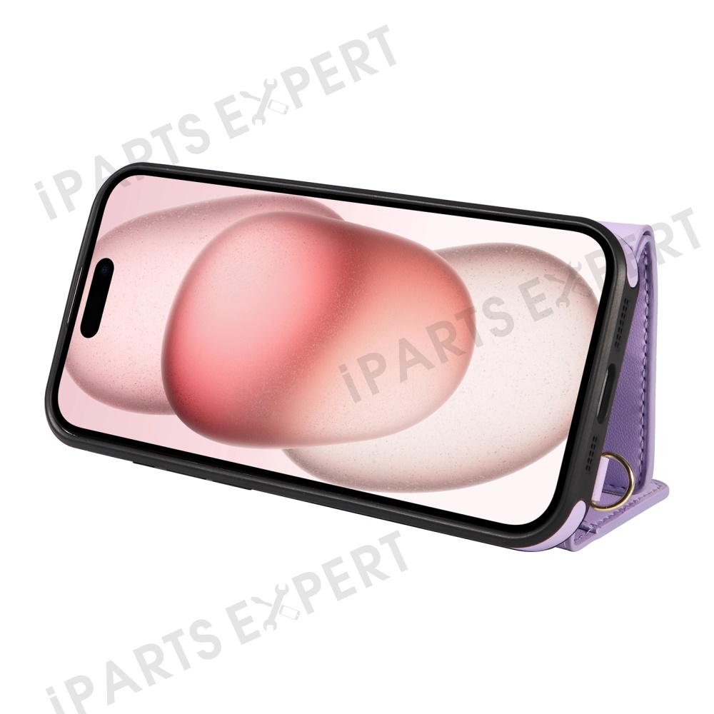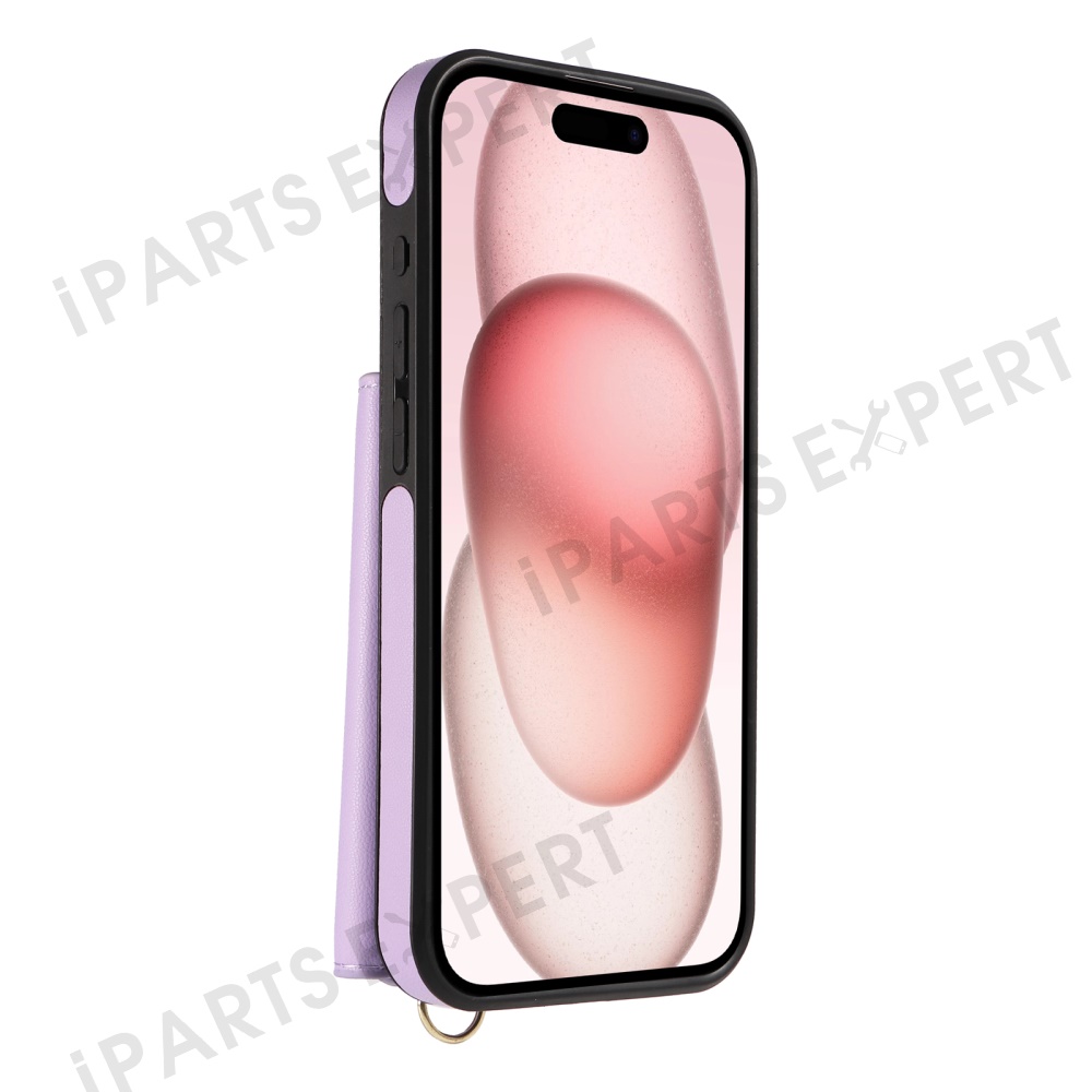 For iPhone 15 Crossbody Phone Case Card Holder Kickstand Leather Coated TPU Mobile Cover - Purple