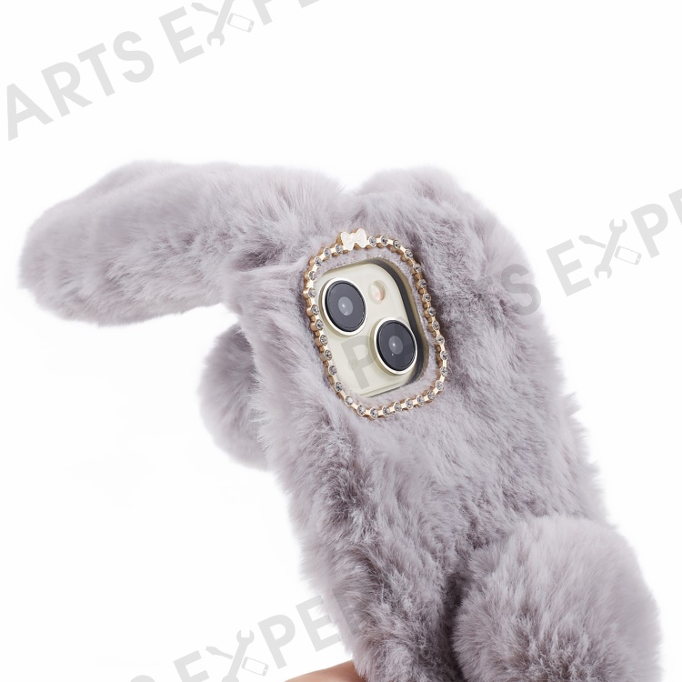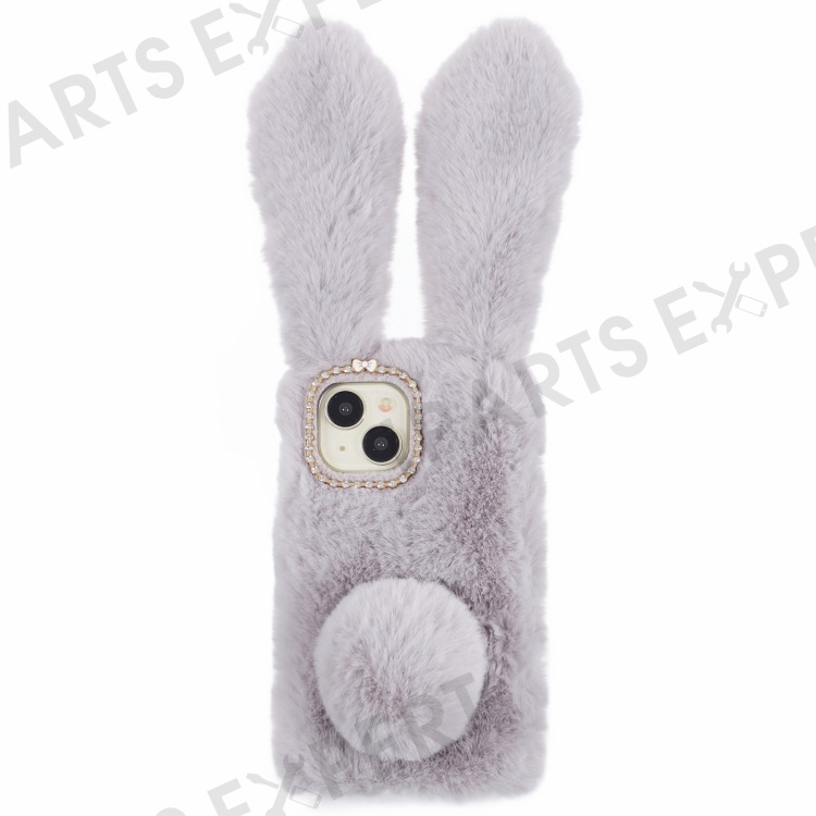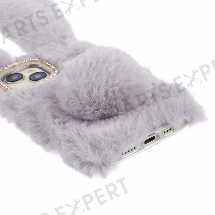 For iPhone 15 Fluffy Bunny Ear Case Flexible TPU Protective Phone Cover - Light Grey