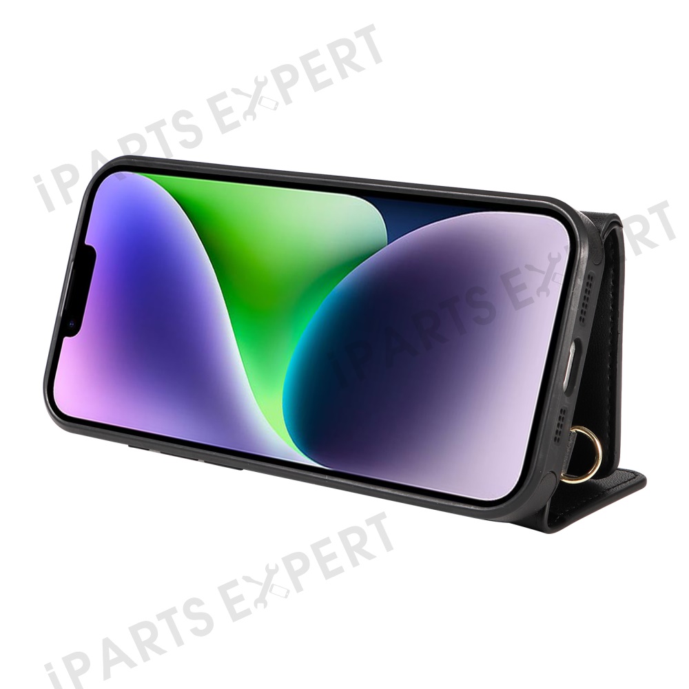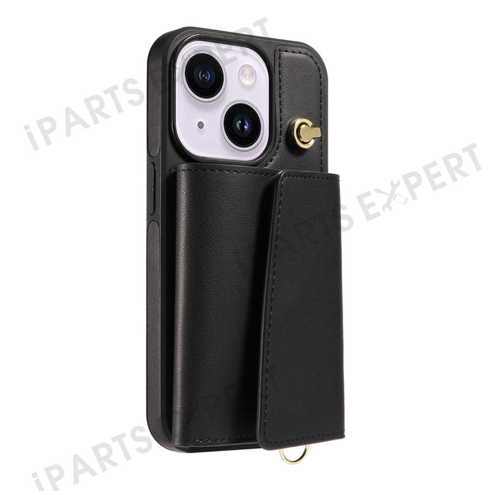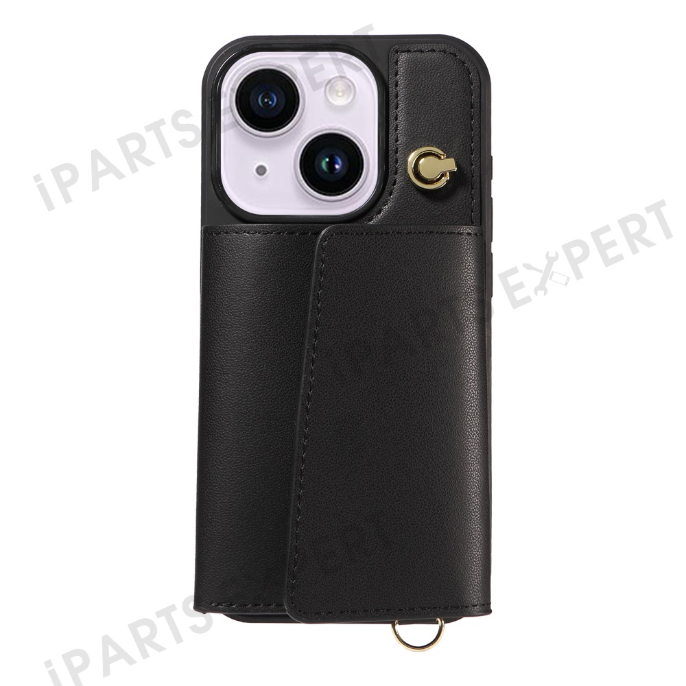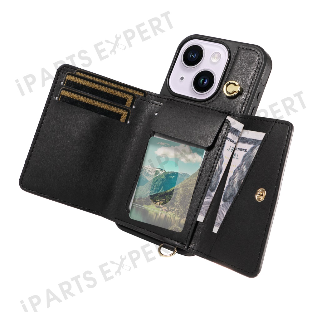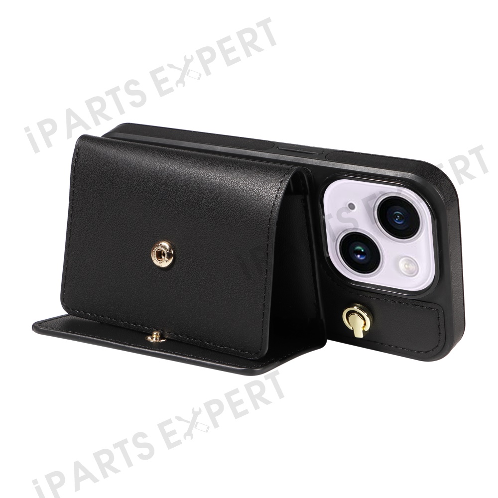 For iPhone 15 Plus / 14 Plus Crossbody Phone Case Card Holder Kickstand Leather Coated TPU Mobile Cover - Black