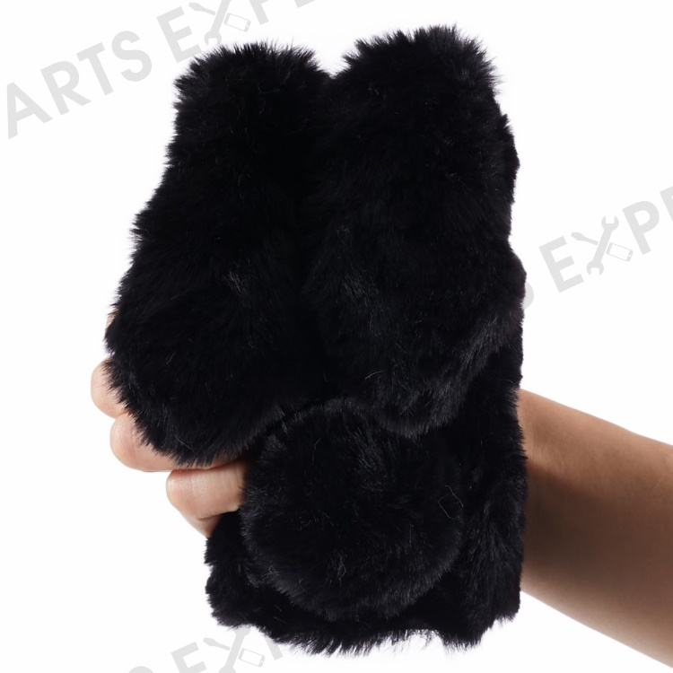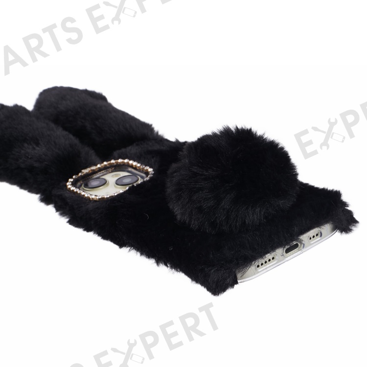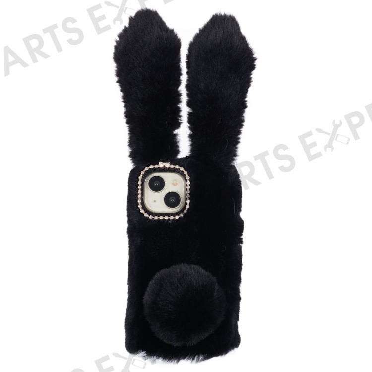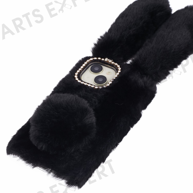 For iPhone 15 Plus 3D Bunny Ears Fluffy Case Soft TPU Furry Warm Winter Phone Cover - Black