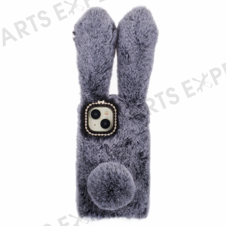 For iPhone 15 Plus 3D Bunny Ears Fluffy Case Soft TPU Furry Warm Winter Phone Cover - Dark Grey