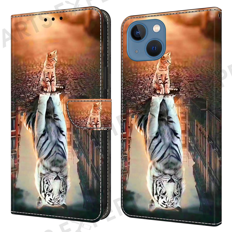 For iPhone 15 Plus Shockproof Case 3D Pattern Printing Leather Flip Phone Cover - Cat and Tiger
