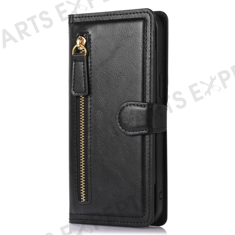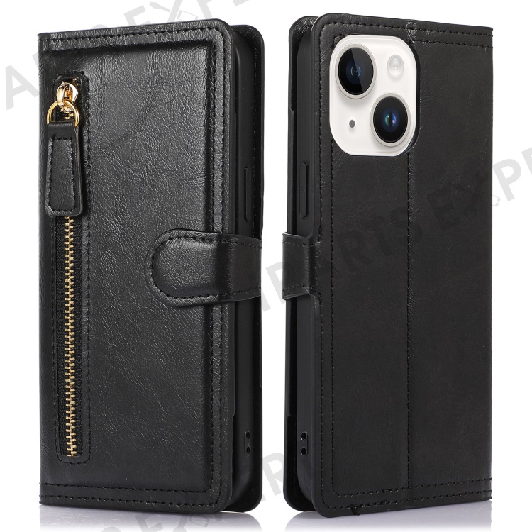 For iPhone 15 Plus Slim-Fit PU Leather Case Wallet Zipper Pocket Flip Stand Phone Cover Shell - Black