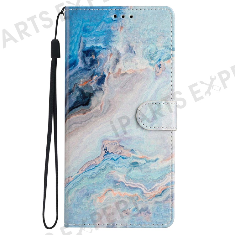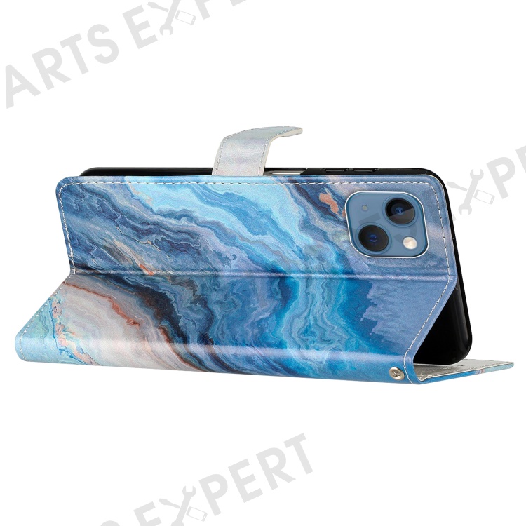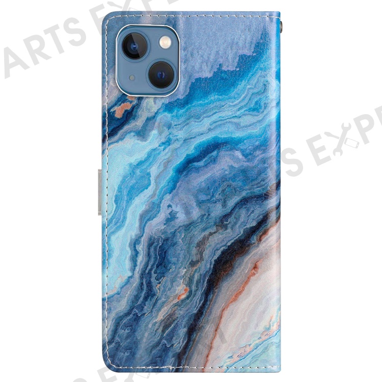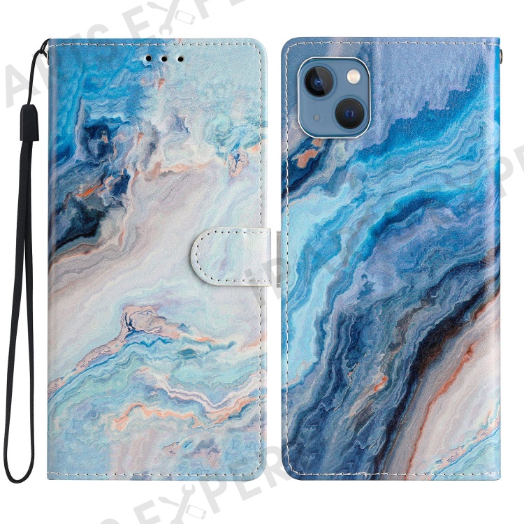 For iPhone 15 Plus Wallet Case PU Leather Pattern Printing Stand Phone Cover with Strap - Blue Marble