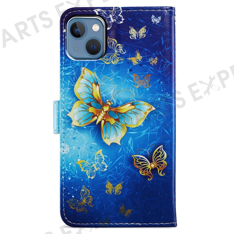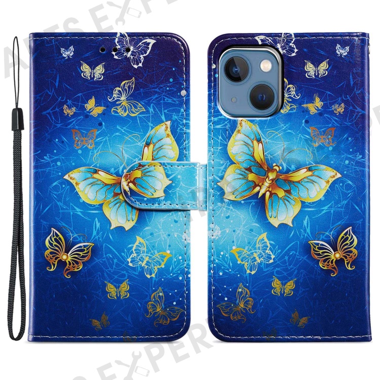 For iPhone 15 Plus Wallet Case PU Leather Pattern Printing Stand Phone Cover with Strap - Golden Butterfly