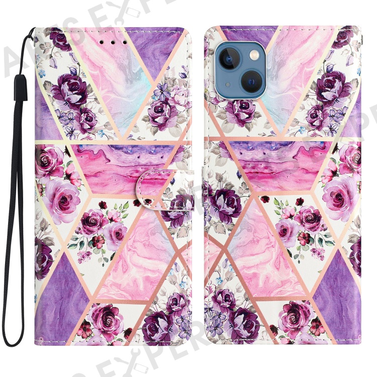 For iPhone 15 Plus Wallet Case PU Leather Pattern Printing Stand Phone Cover with Strap - Purple Flowers