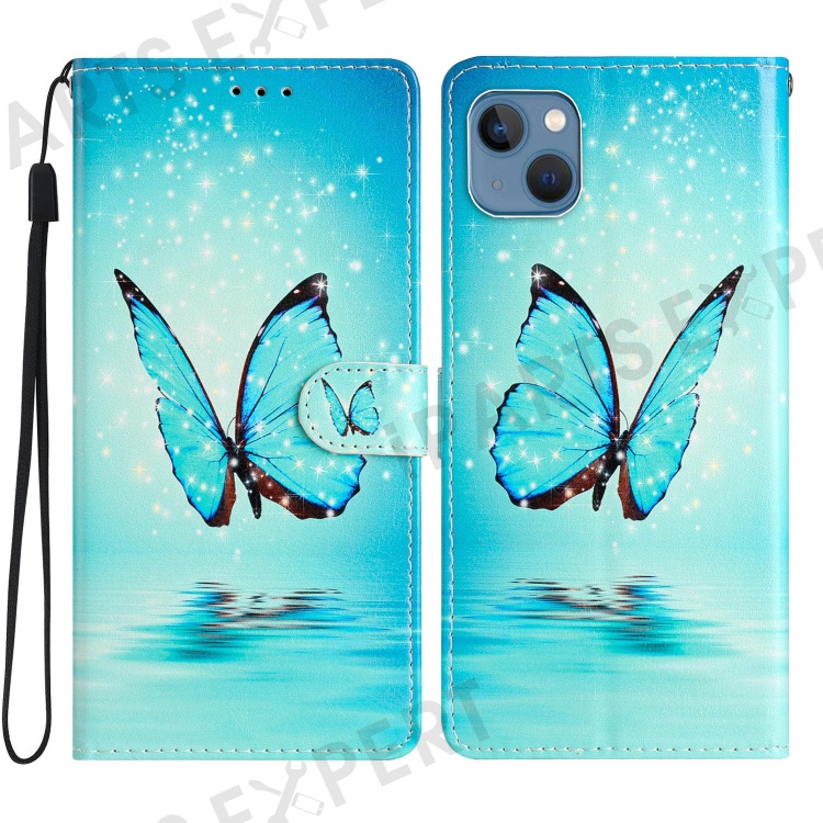 For iPhone 15 PU Leather Flip Cover Wallet Stand Pattern Printing Phone Case with Strap - Blue Butterfly
