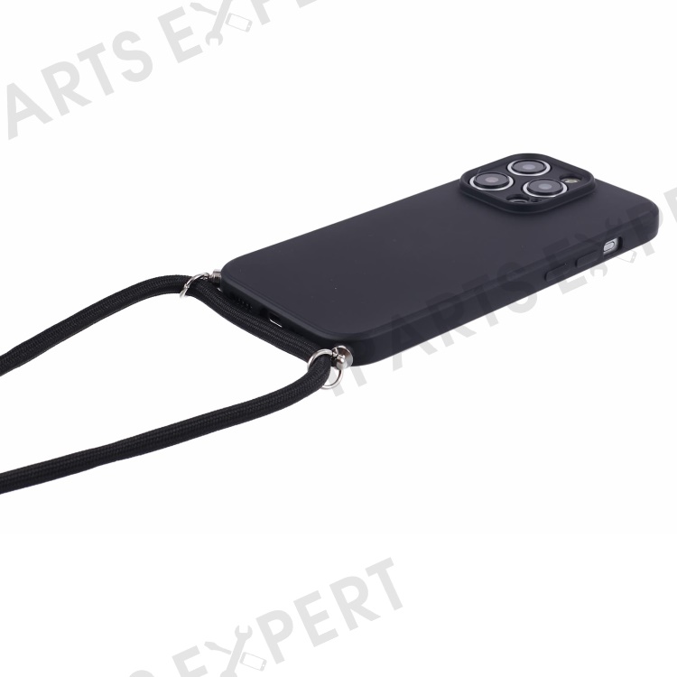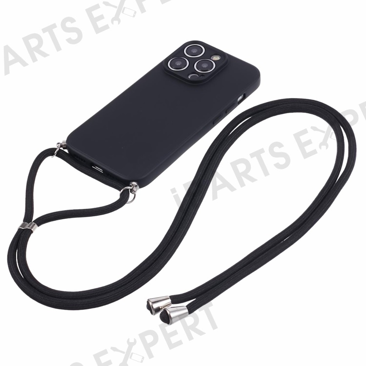 For iPhone 15 Pro Case Candy Color Rubberized Phone Cover with Long Lanyard - Black