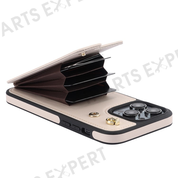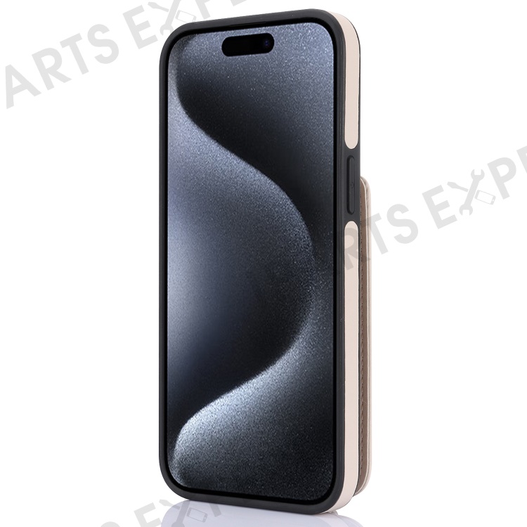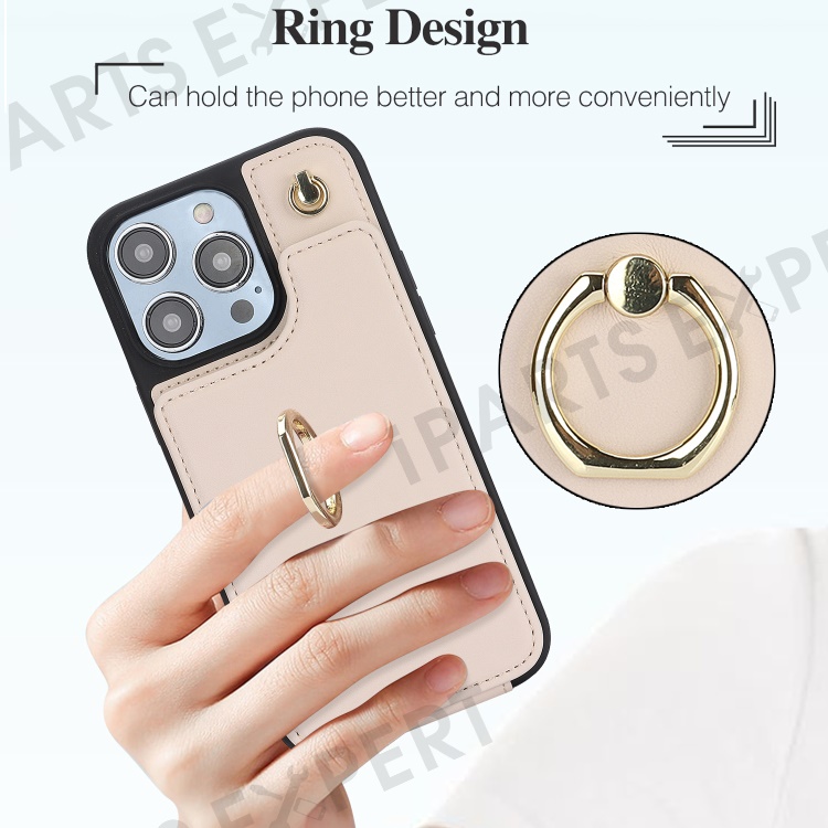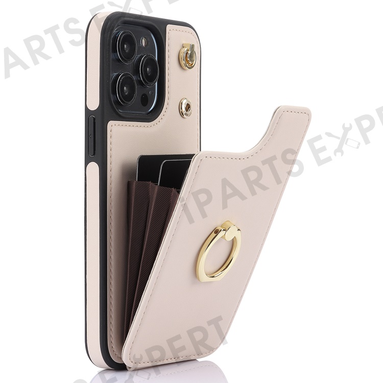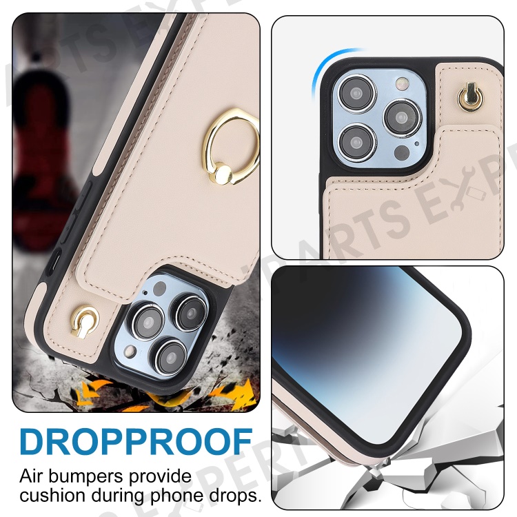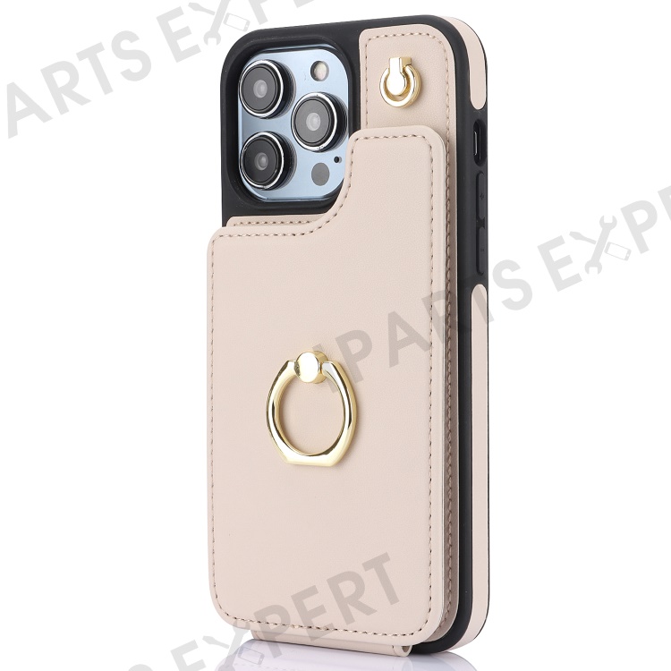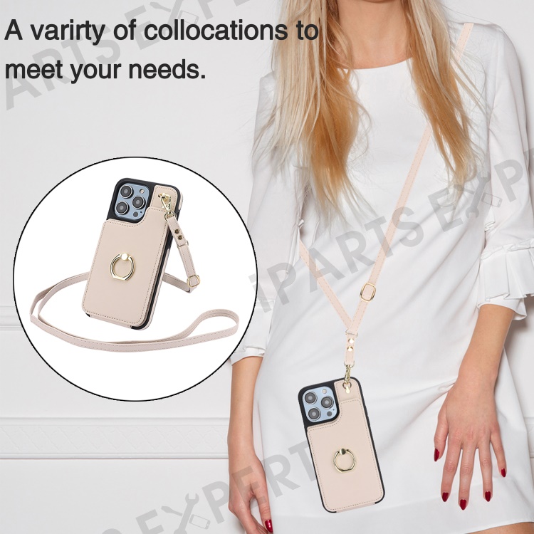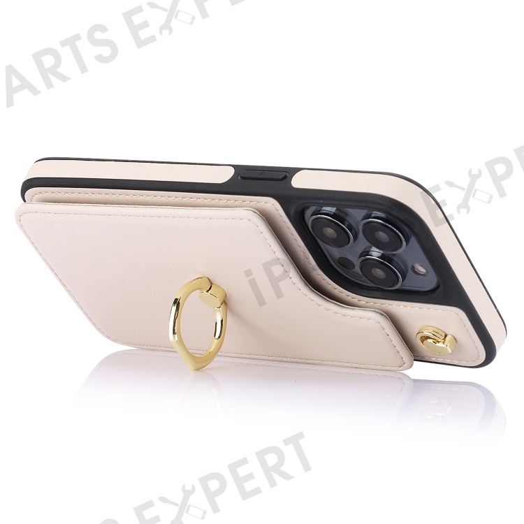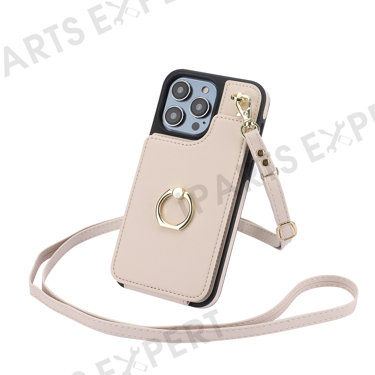 For iPhone 15 Pro Case Crossbody PU Leather+TPU Card Holder Phone Cover with Shoulder Strap - Apricot