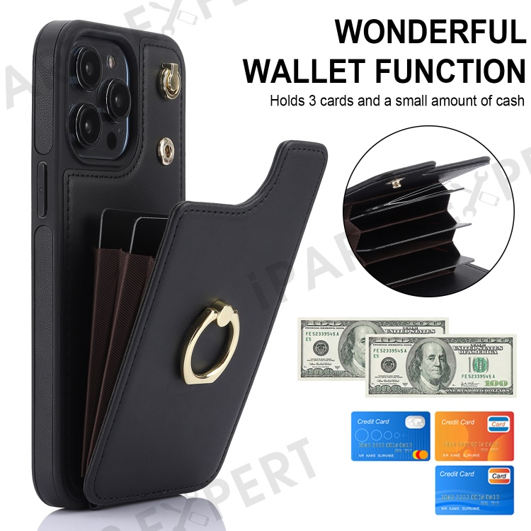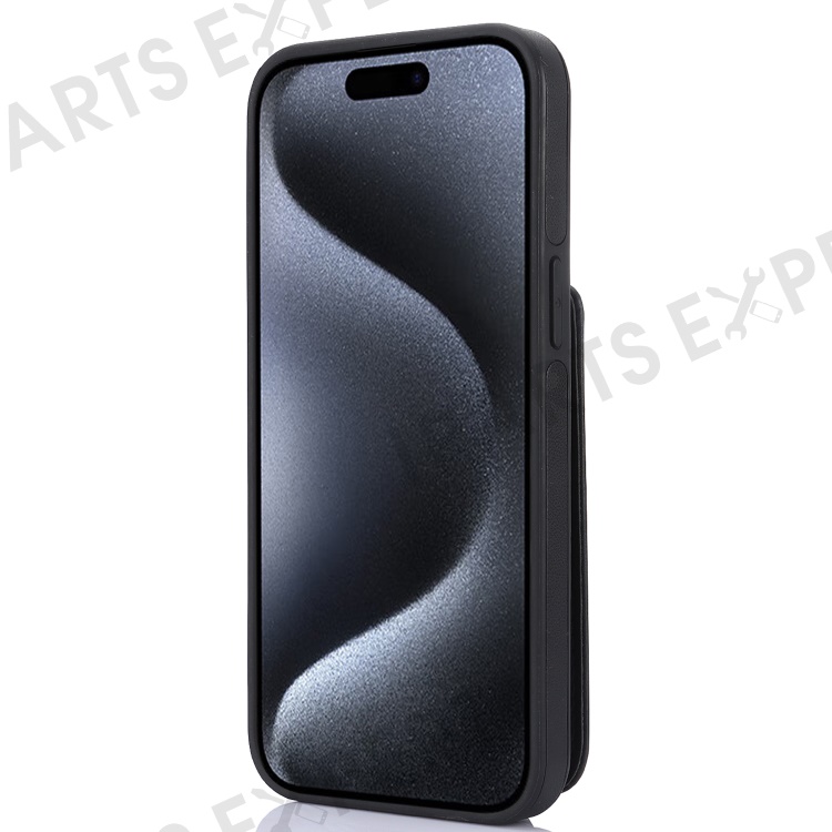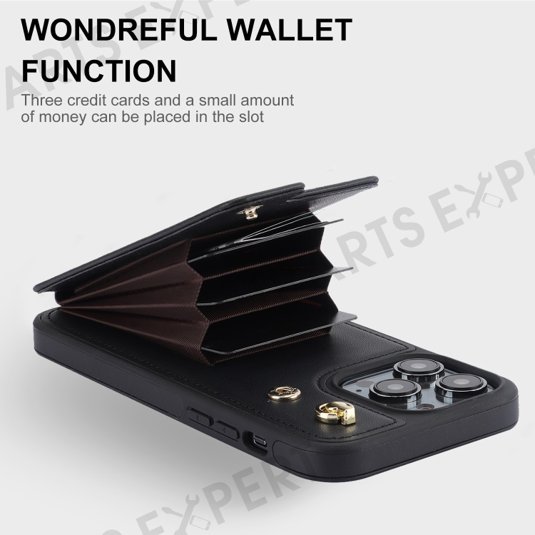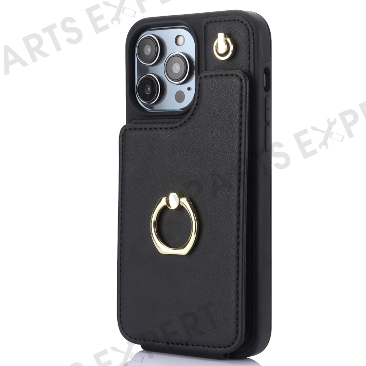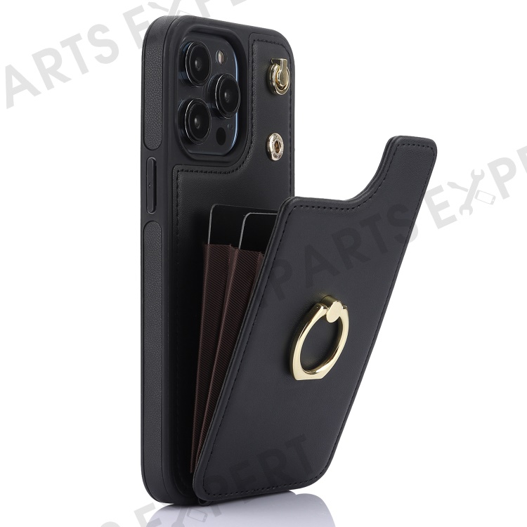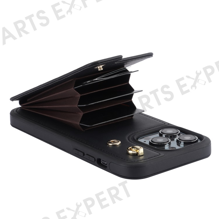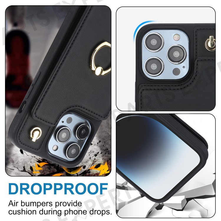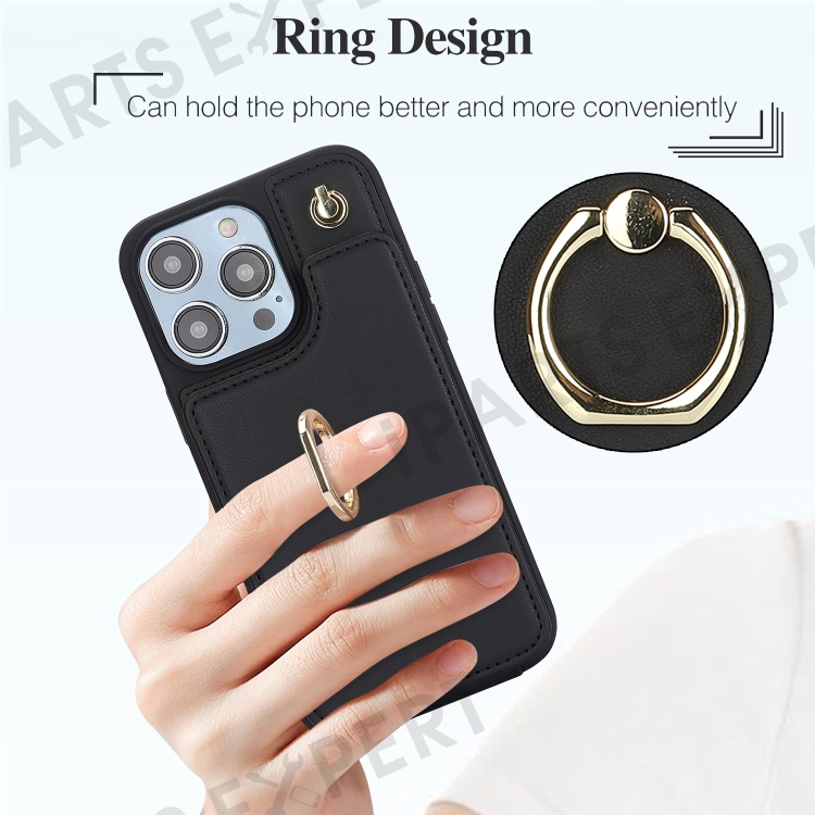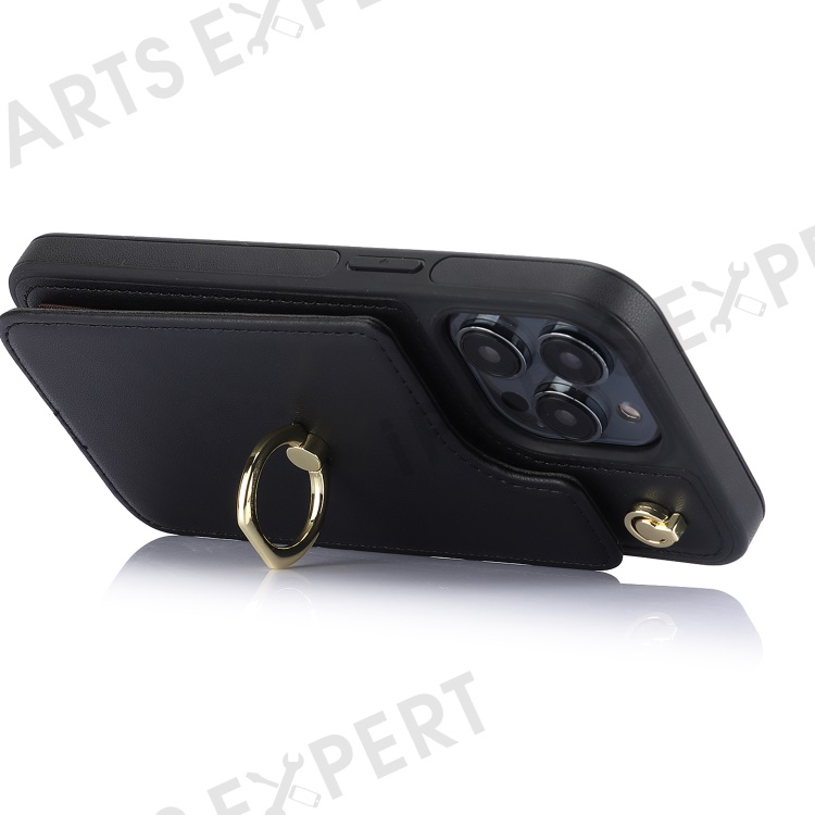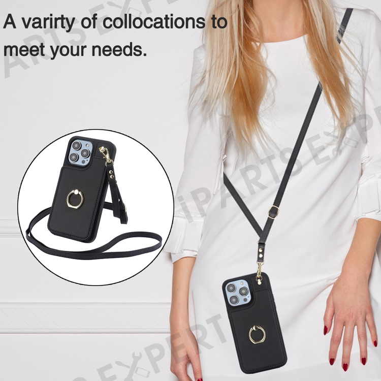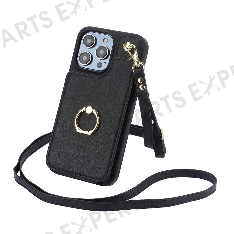 For iPhone 15 Pro Case Crossbody PU Leather+TPU Card Holder Phone Cover with Shoulder Strap - Black