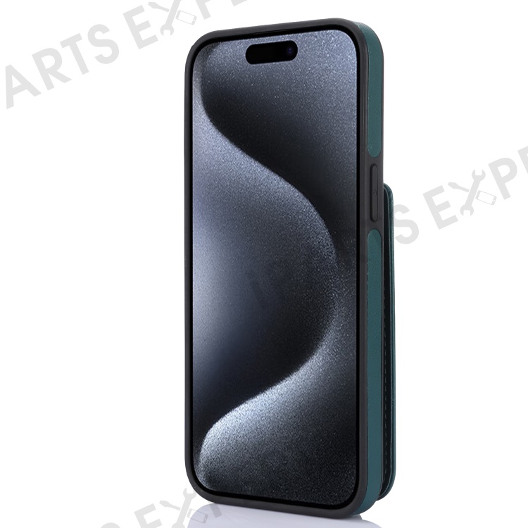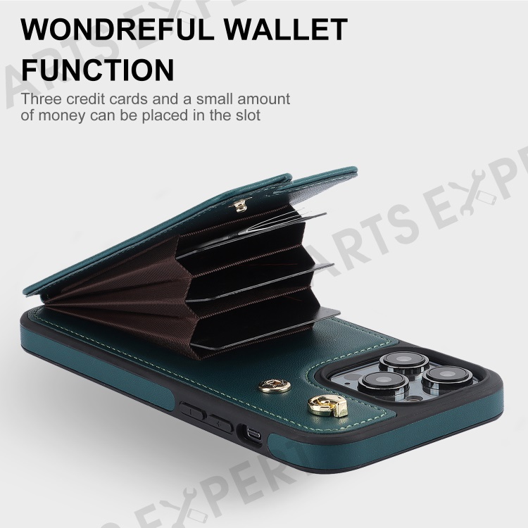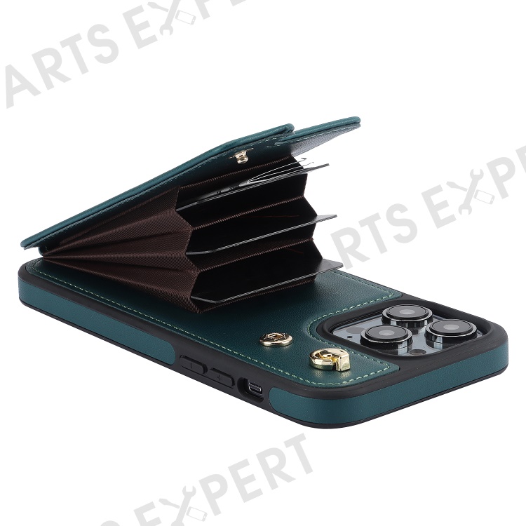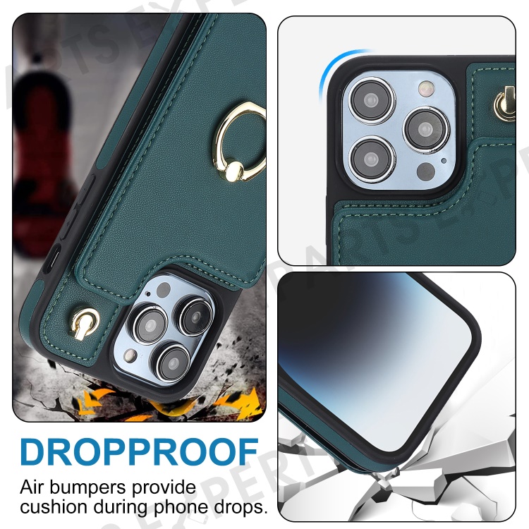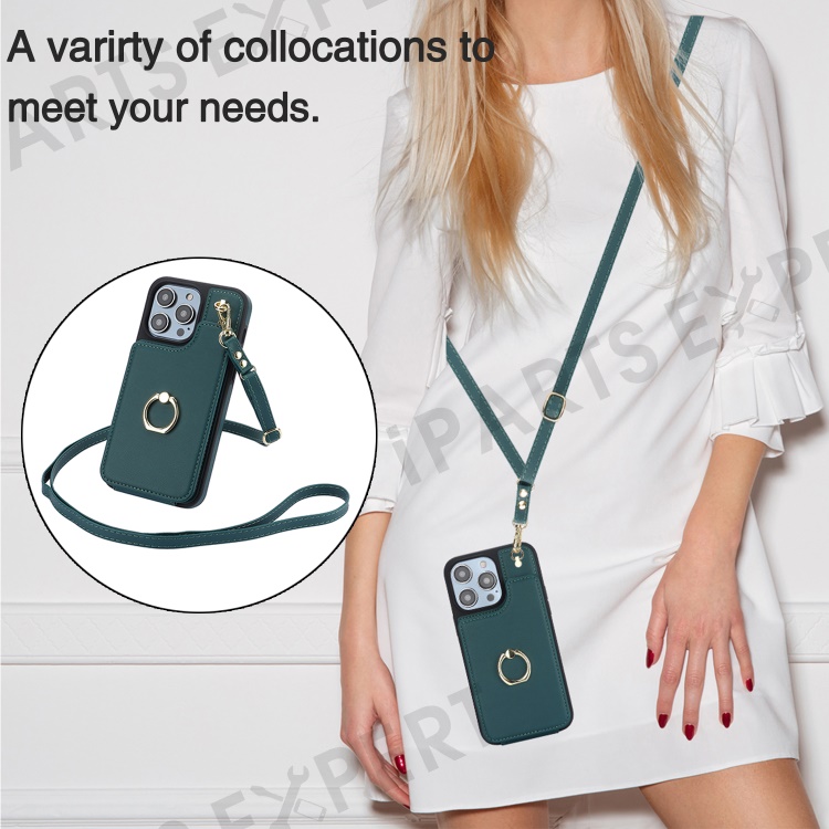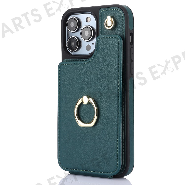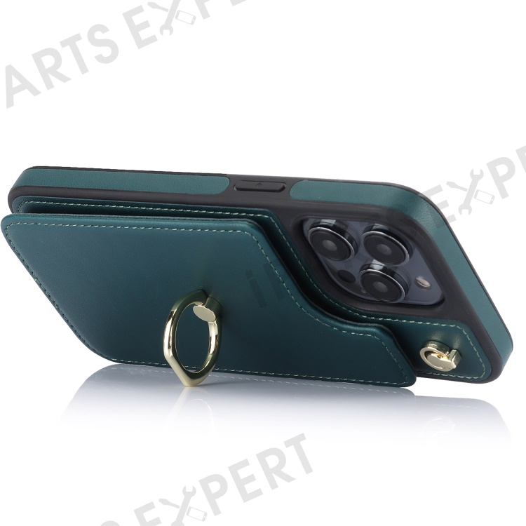 For iPhone 15 Pro Case Crossbody PU Leather+TPU Card Holder Phone Cover with Shoulder Strap - Blackish Green