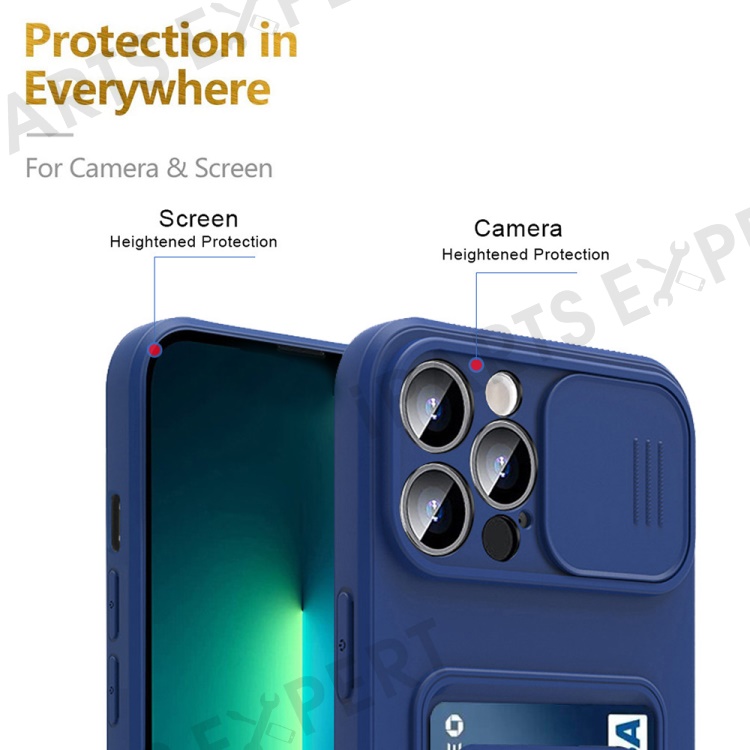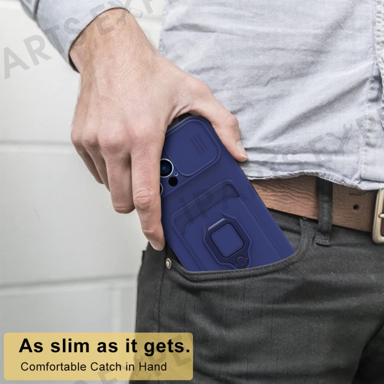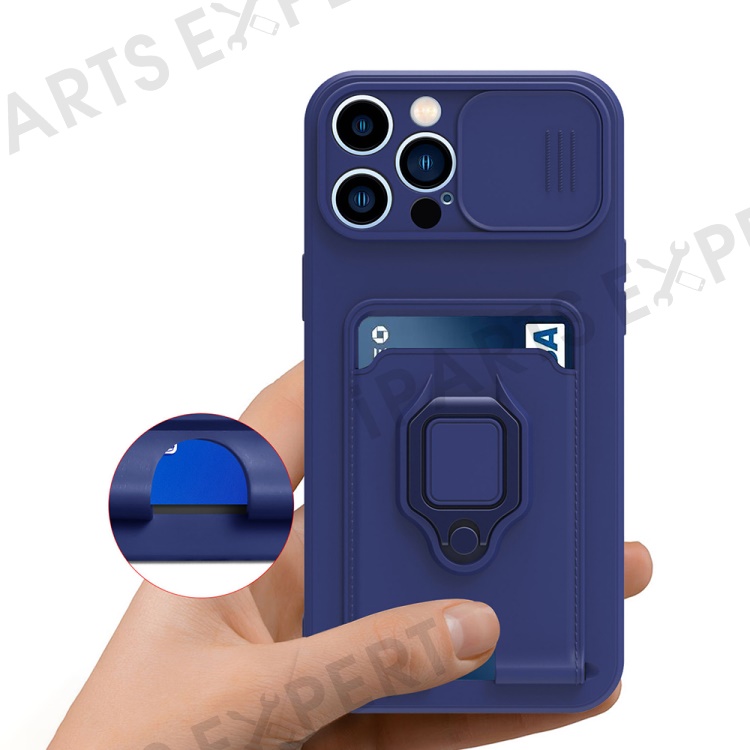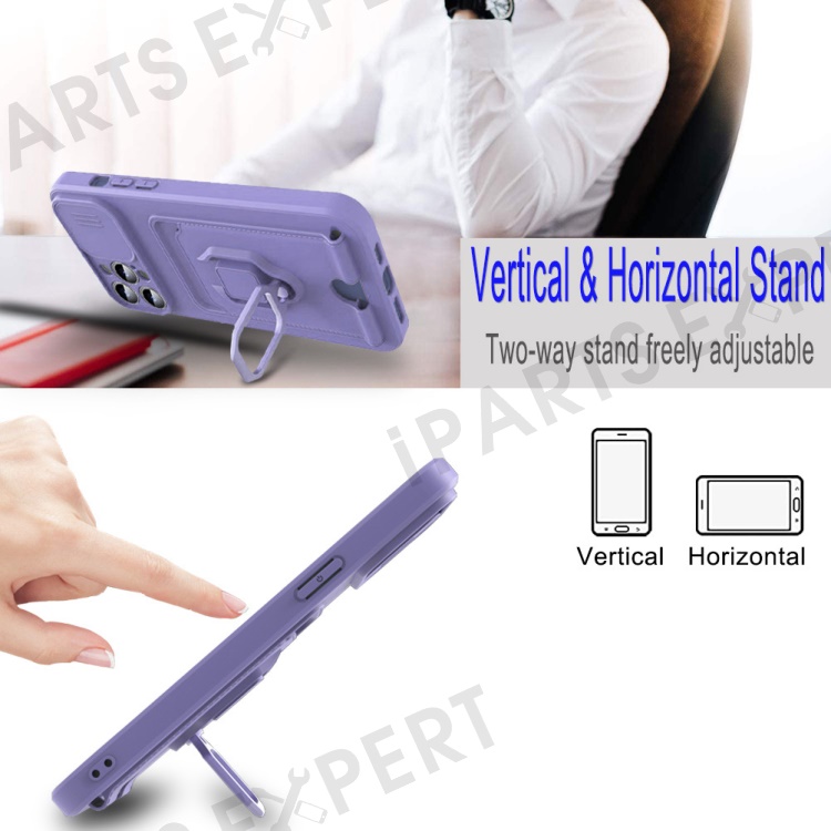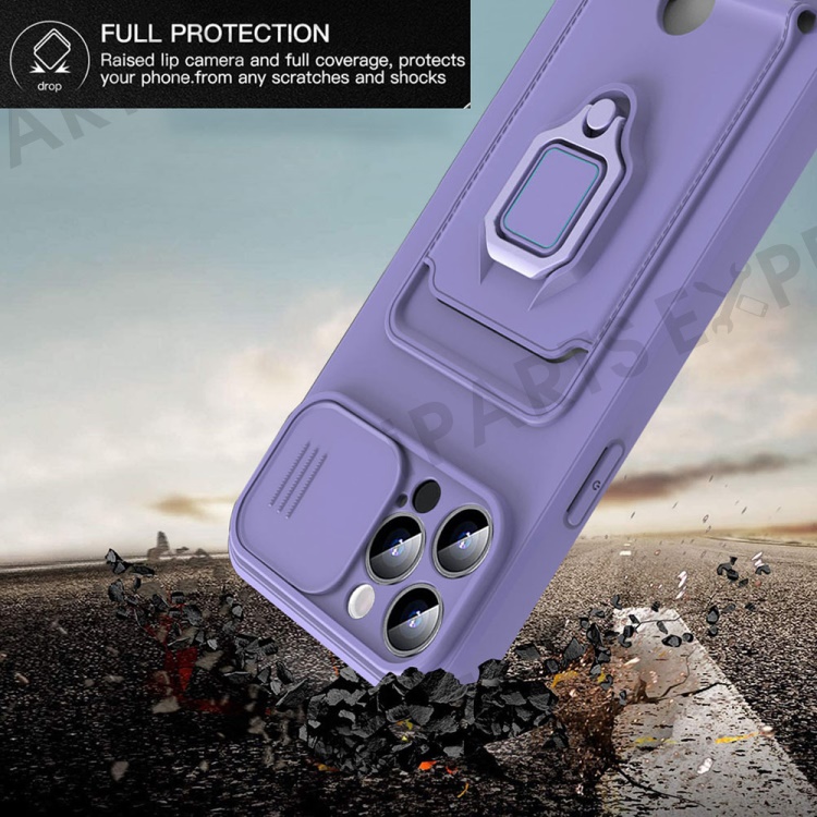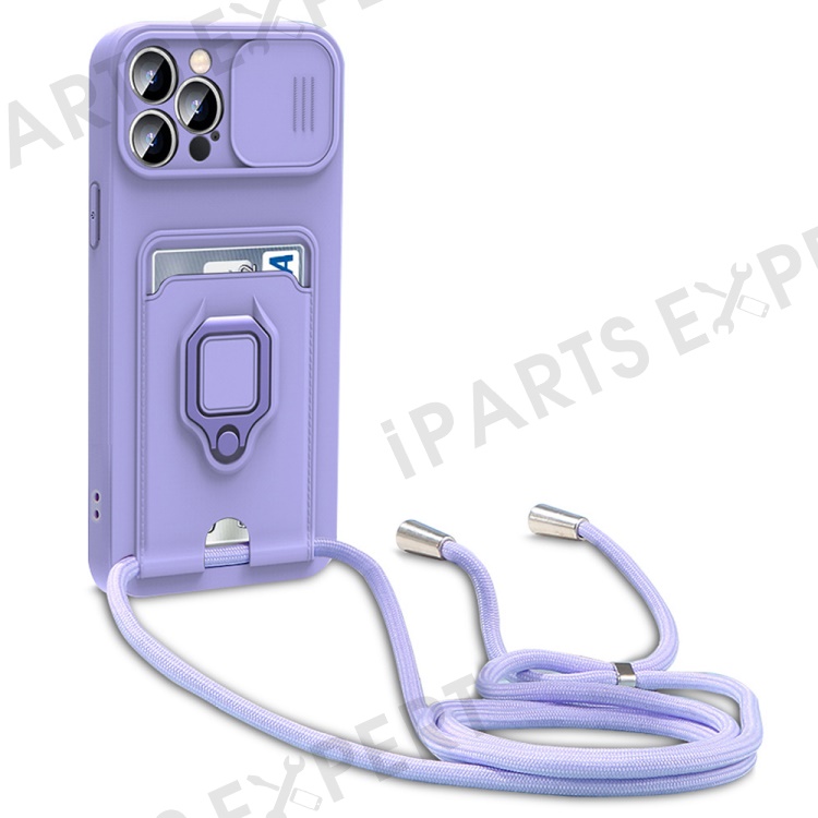 For iPhone 15 Pro Case PC+TPU Cell Phone Cover Card Holder Kickstand Protective Shell with Lanyard - Purple