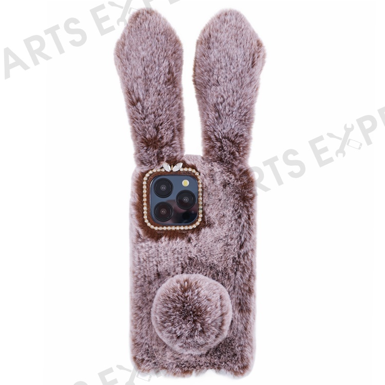 For iPhone 15 Pro Fluffy 3D Bunny Ears Cover Winter Warm Soft TPU Phone Case - Brown