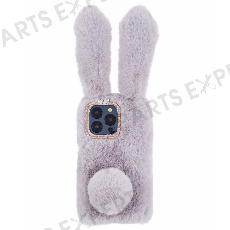 For iPhone 15 Pro Fluffy 3D Bunny Ears Cover Winter Warm Soft TPU Phone Case - Light Grey