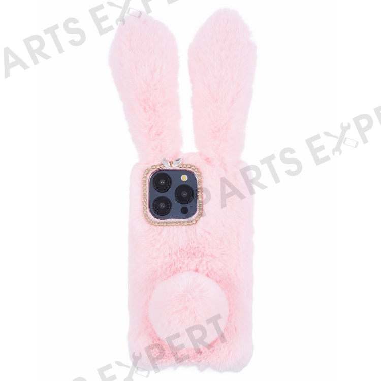 For iPhone 15 Pro Fluffy 3D Bunny Ears Cover Winter Warm Soft TPU Phone Case - Pink