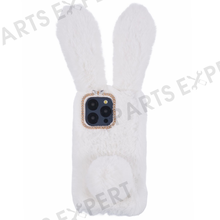 For iPhone 15 Pro Fluffy 3D Bunny Ears Cover Winter Warm Soft TPU Phone Case - White