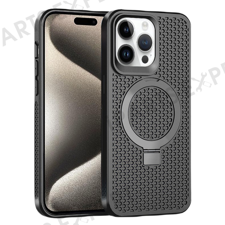 For iPhone 15 Pro Heat Dissipation Rubberized TPU Case Kickstand Magnetic Protective Phone Cover - Black