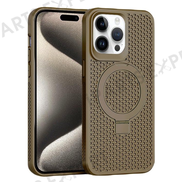 For iPhone 15 Pro Heat Dissipation Rubberized TPU Case Kickstand Magnetic Protective Phone Cover - Brown