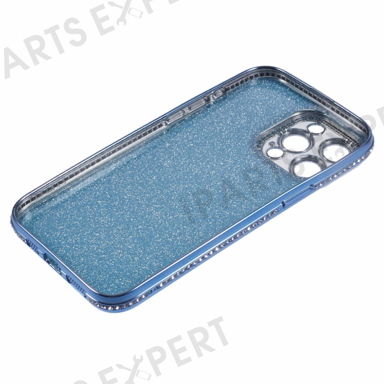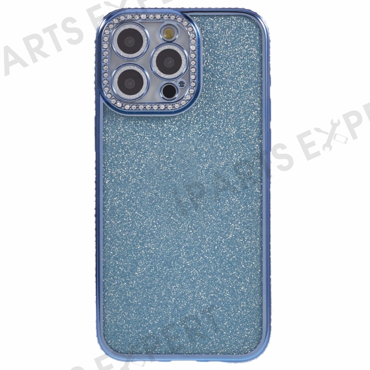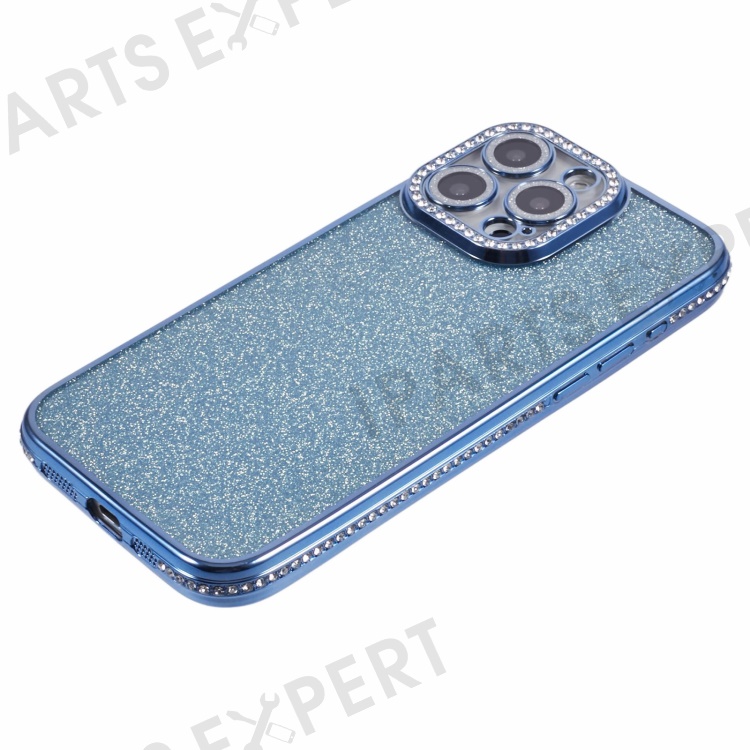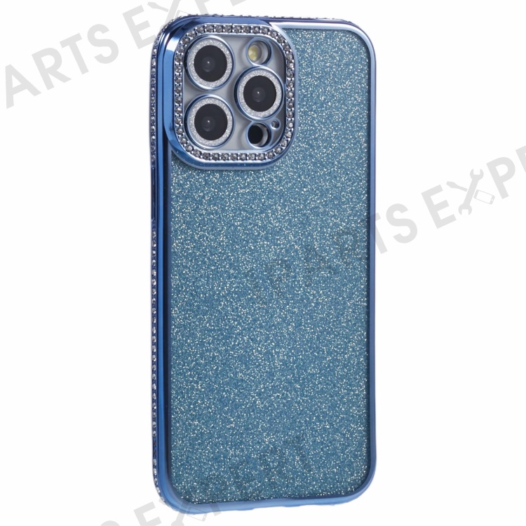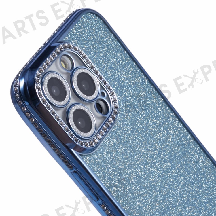 For iPhone 15 Pro Max Case Camera Lens Guard Clear Phone Back Cover Rhinestone Decor With Glitter Paper - Blue