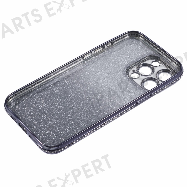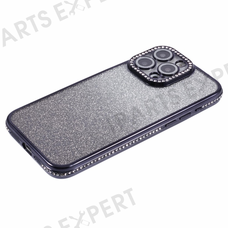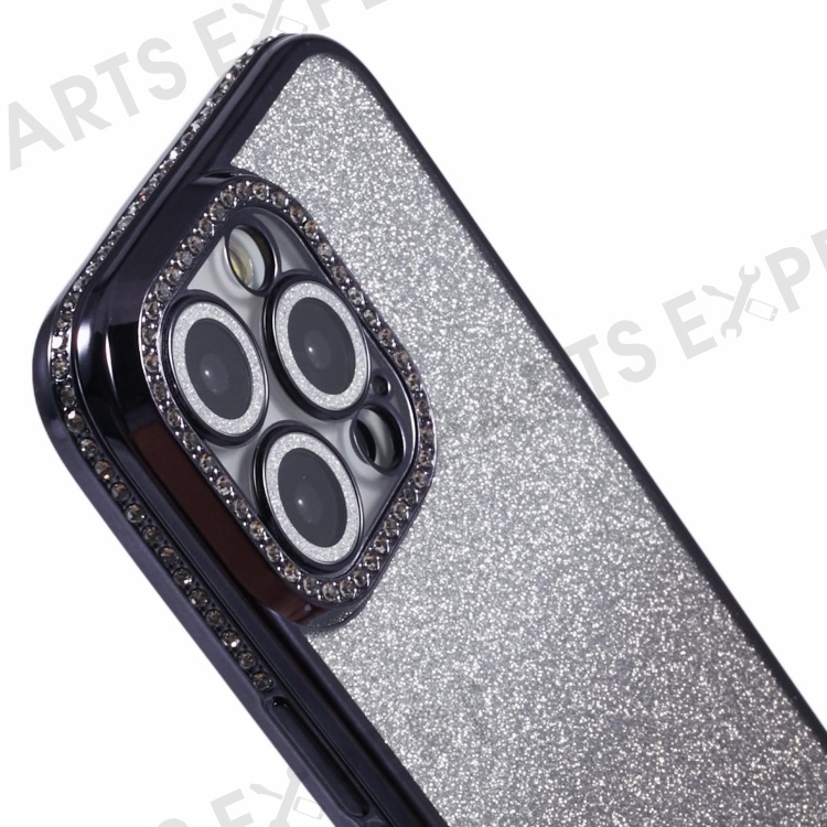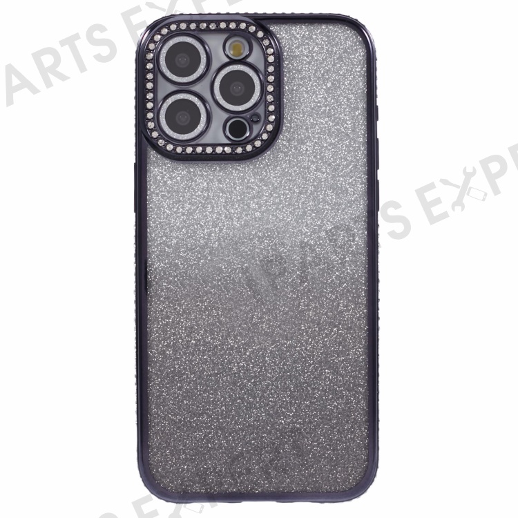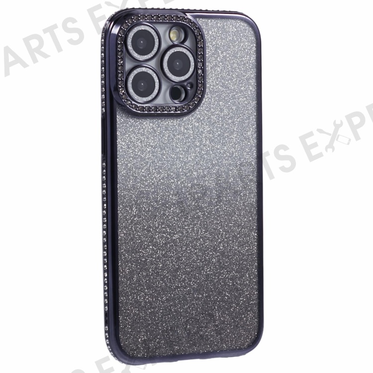 For iPhone 15 Pro Max Case Camera Lens Guard Clear Phone Back Cover Rhinestone Decor With Glitter Paper - Gradient Black