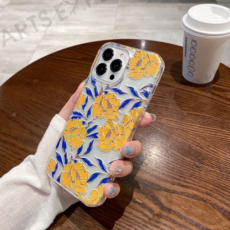 For iPhone 15 Pro Max Case Flower Pattern Decor Anti-Scratch TPU+PC Phone Protective Cover - Blue Leaves Yellow Flowers