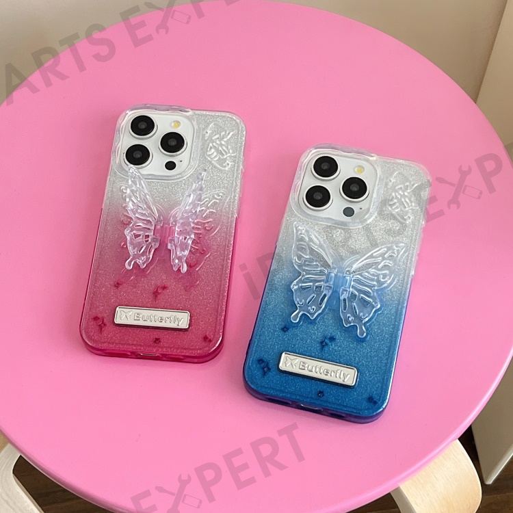 For iPhone 15 Pro Max Case Gradient Butterfly Shape Kickstand Phone Cover with Built-In Glitter Powder Paper - Pink