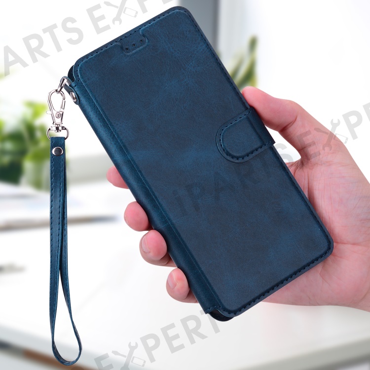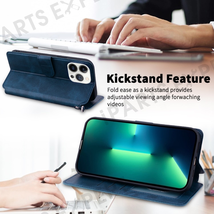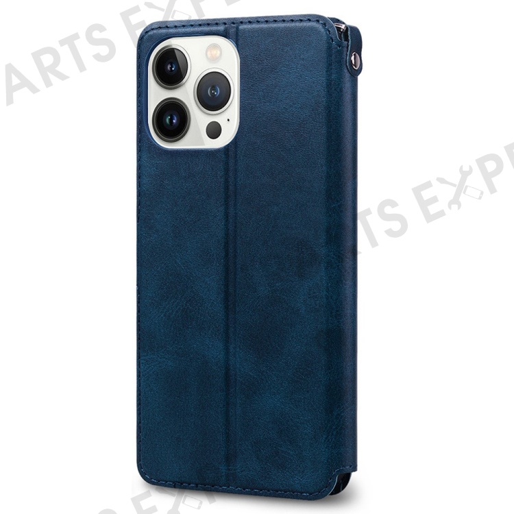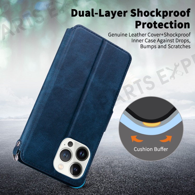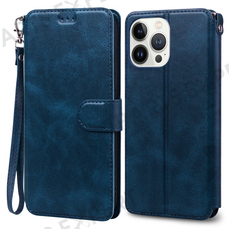 For iPhone 15 Pro Max Case PU Leather Flip Stand Wallet Phone Cover with Wrist Strap - Blue