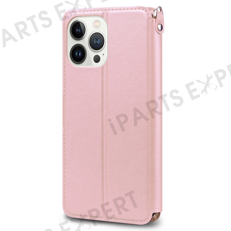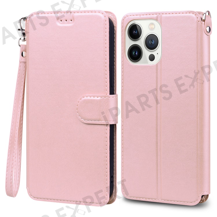 For iPhone 15 Pro Max Case PU Leather Flip Stand Wallet Phone Cover with Wrist Strap - Pink