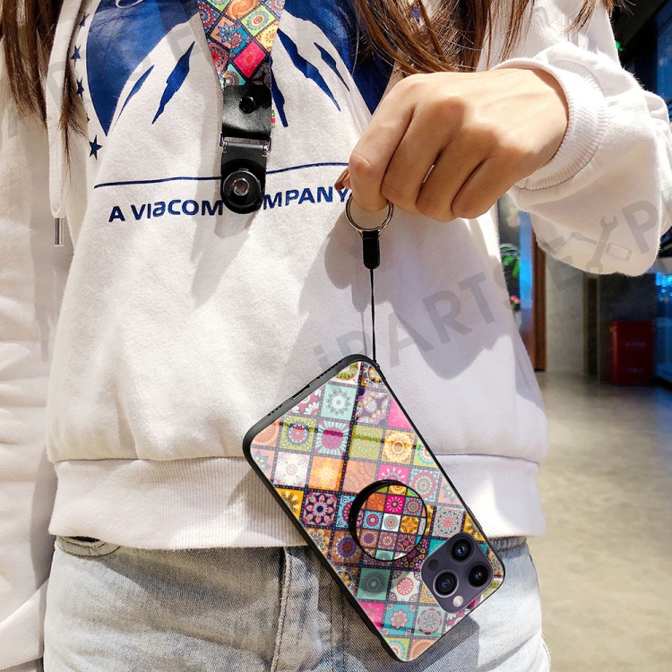 For iPhone 15 Pro Max Flower Pattern Kickstand Case Tempered Glass+PC+TPU Phone Cover with Lanyard - Color Pattern