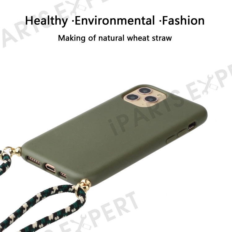 For iPhone 15 Pro Max Mobile Phone Case Biodegradable Wheat Straw+TPU Protection Cover with Lanyard - Army Green