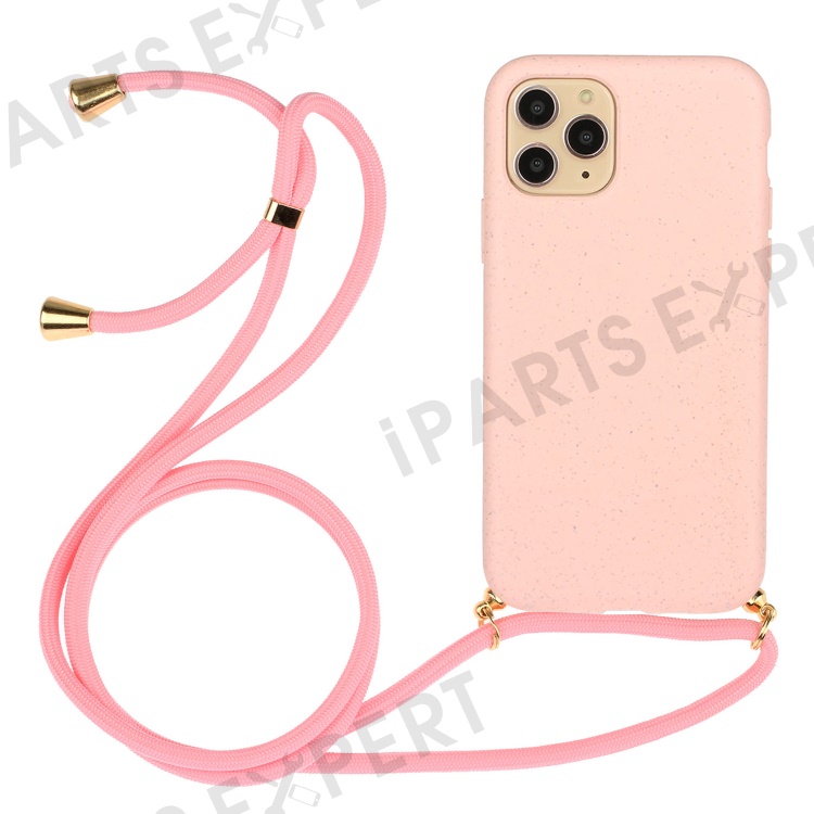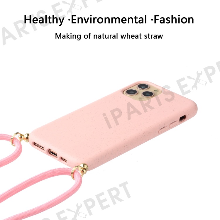 For iPhone 15 Pro Max Mobile Phone Case Biodegradable Wheat Straw+TPU Protection Cover with Lanyard - Pink
