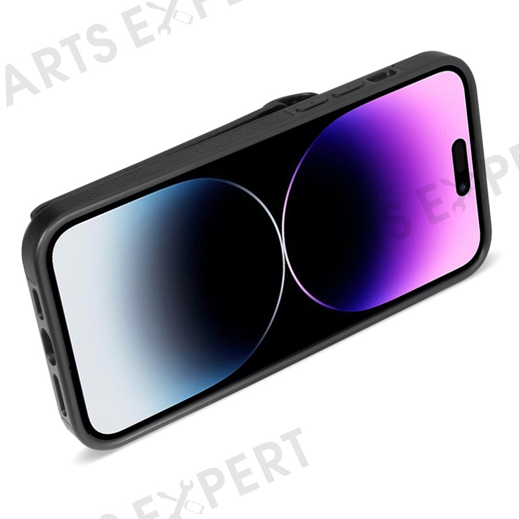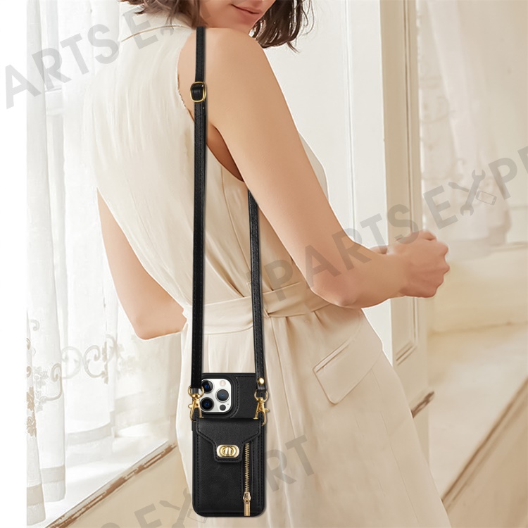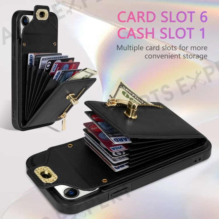 For iPhone 15 Pro Max Zipper Pocket Leather Coated TPU Phone Case Card Holder Kickstand Cover - Black