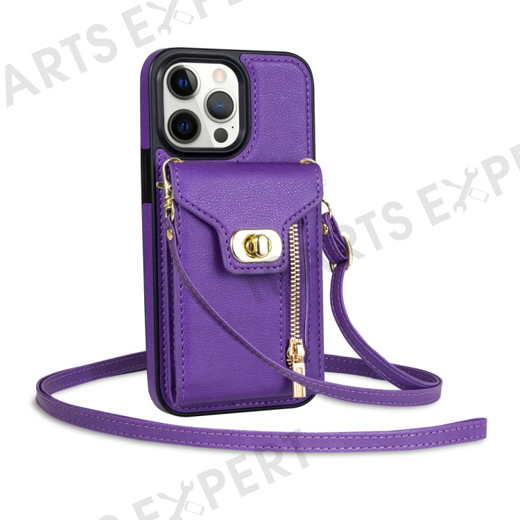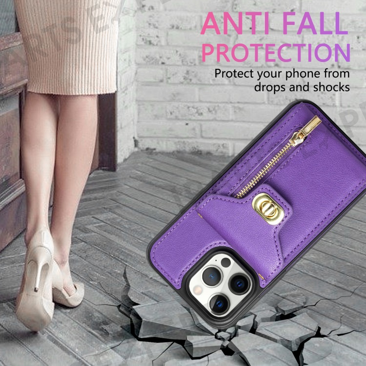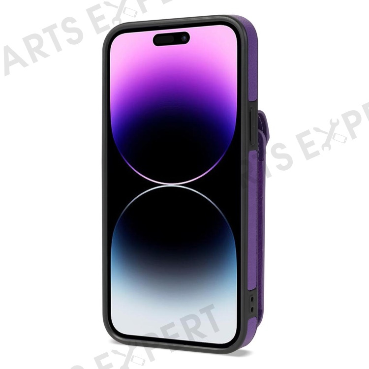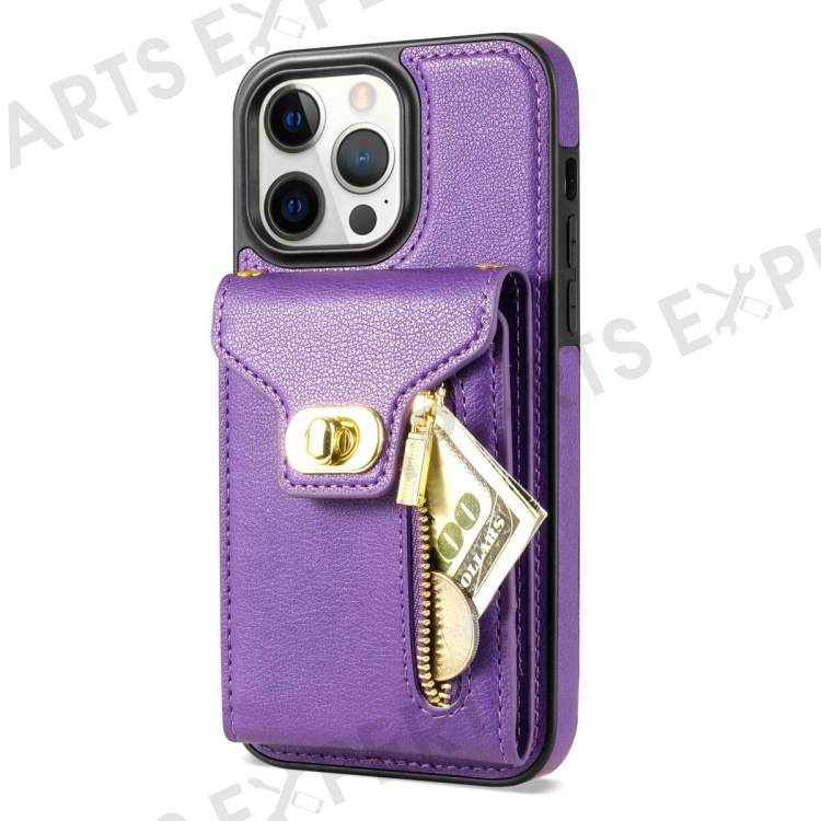 For iPhone 15 Pro Max Zipper Pocket Leather Coated TPU Phone Case Card Holder Kickstand Cover - Purple