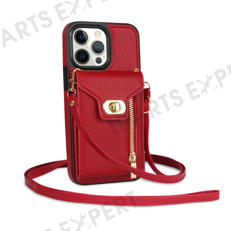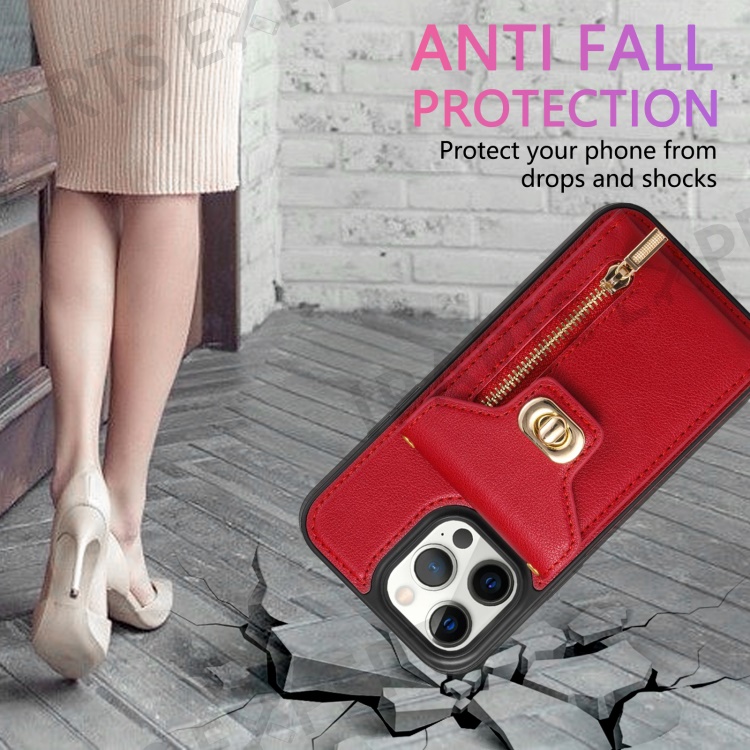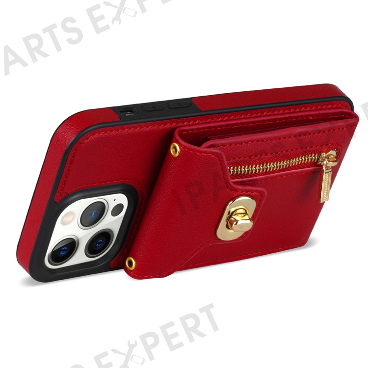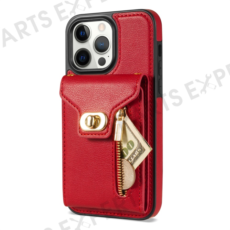 For iPhone 15 Pro Max Zipper Pocket Leather Coated TPU Phone Case Card Holder Kickstand Cover - Red